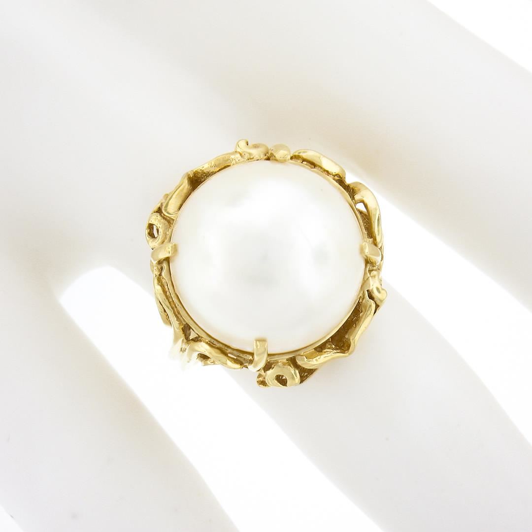 A vintage solid 14k yellow gold ring, with 1 round shape cultured mabe pearl (14.8mm). The ring is size 6.5, weighs a total of 7.01 grams, and measures 18.8mm wide.