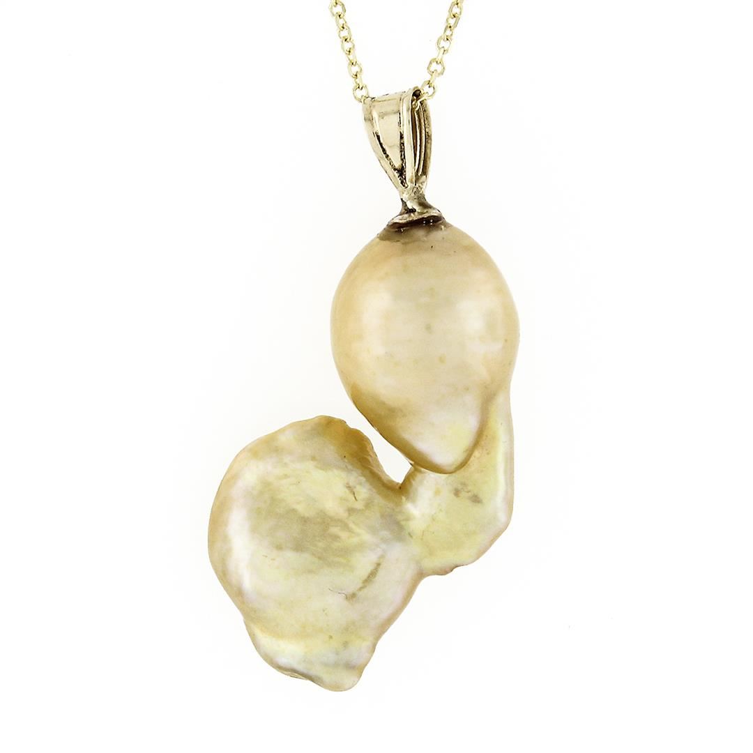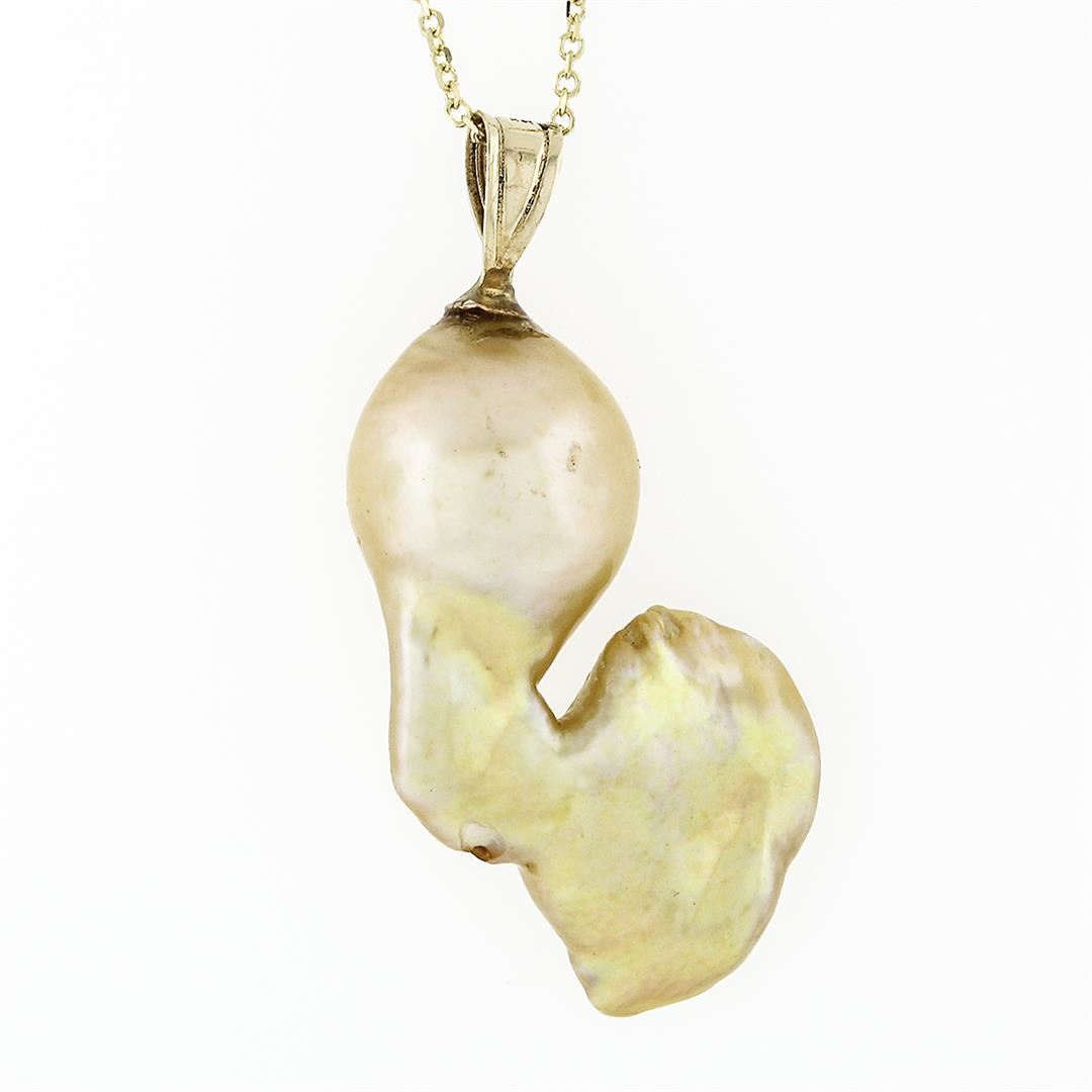 A vintage solid 14k yellow gold freeform pendant necklace, featuring 1 baroque shape natural pearl. 18 inch cable link chain, 7.57 grams total weight, pendant measures 39.4x20.4mm.