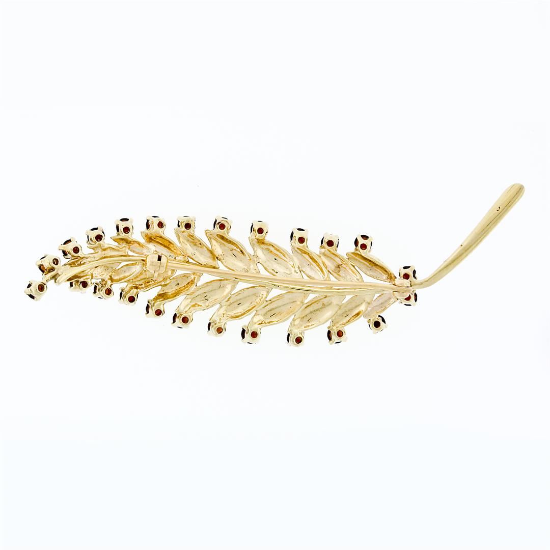 A vintage 14k yellow gold long feather leaf brooch with 24 round brilliant cut natural garnets (1.68ctw). Measures 69.2x18mm and weighs a total of 8.14 grams.