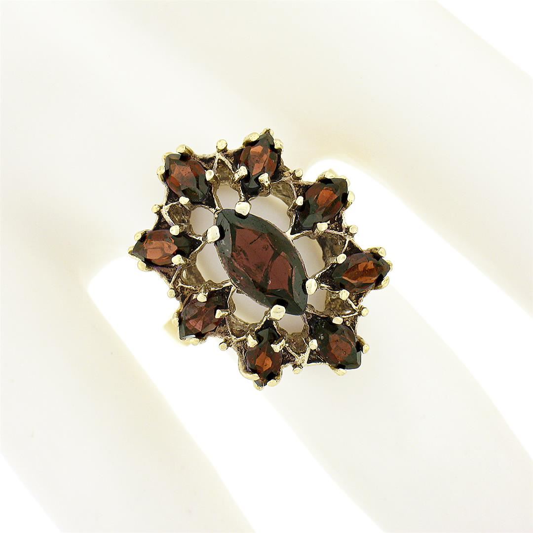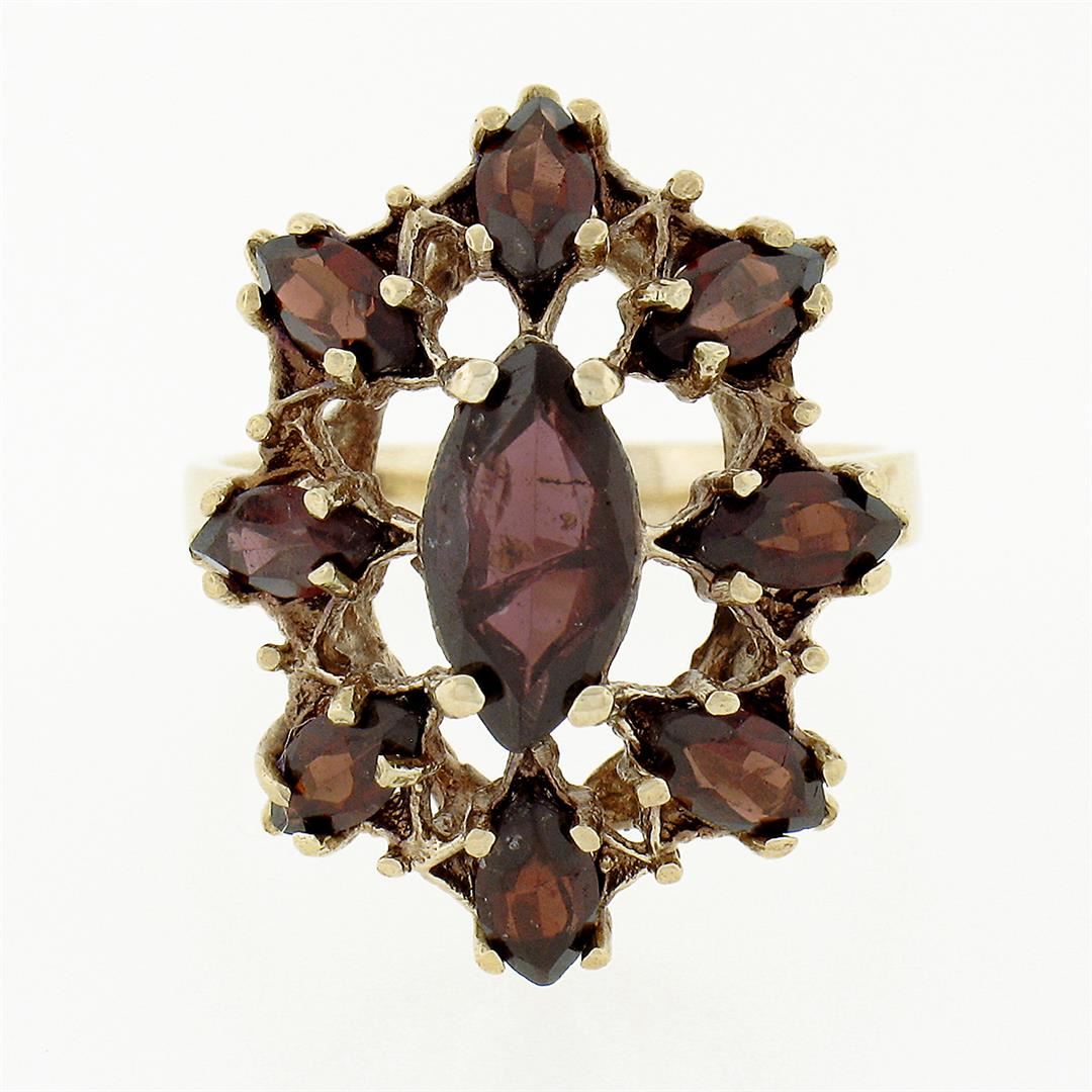 A solid 14k yellow gold flower cocktail ring, with 8 marquise cut natural garnets (3x6mm), and 1 marquise cut natural garnet (5x10mm). The ring is size 7.0, weighs a total of 4.54 grams, and measures 22.40mm wide.