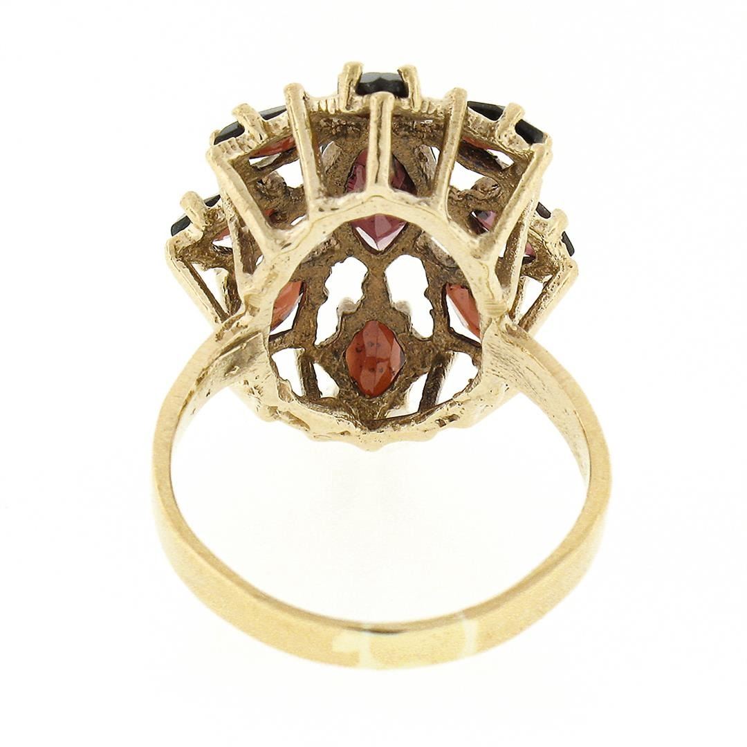 A solid 14k yellow gold flower cocktail ring, with 8 marquise cut natural garnets (3x6mm), and 1 marquise cut natural garnet (5x10mm). The ring is size 7.0, weighs a total of 4.54 grams, and measures 22.40mm wide.