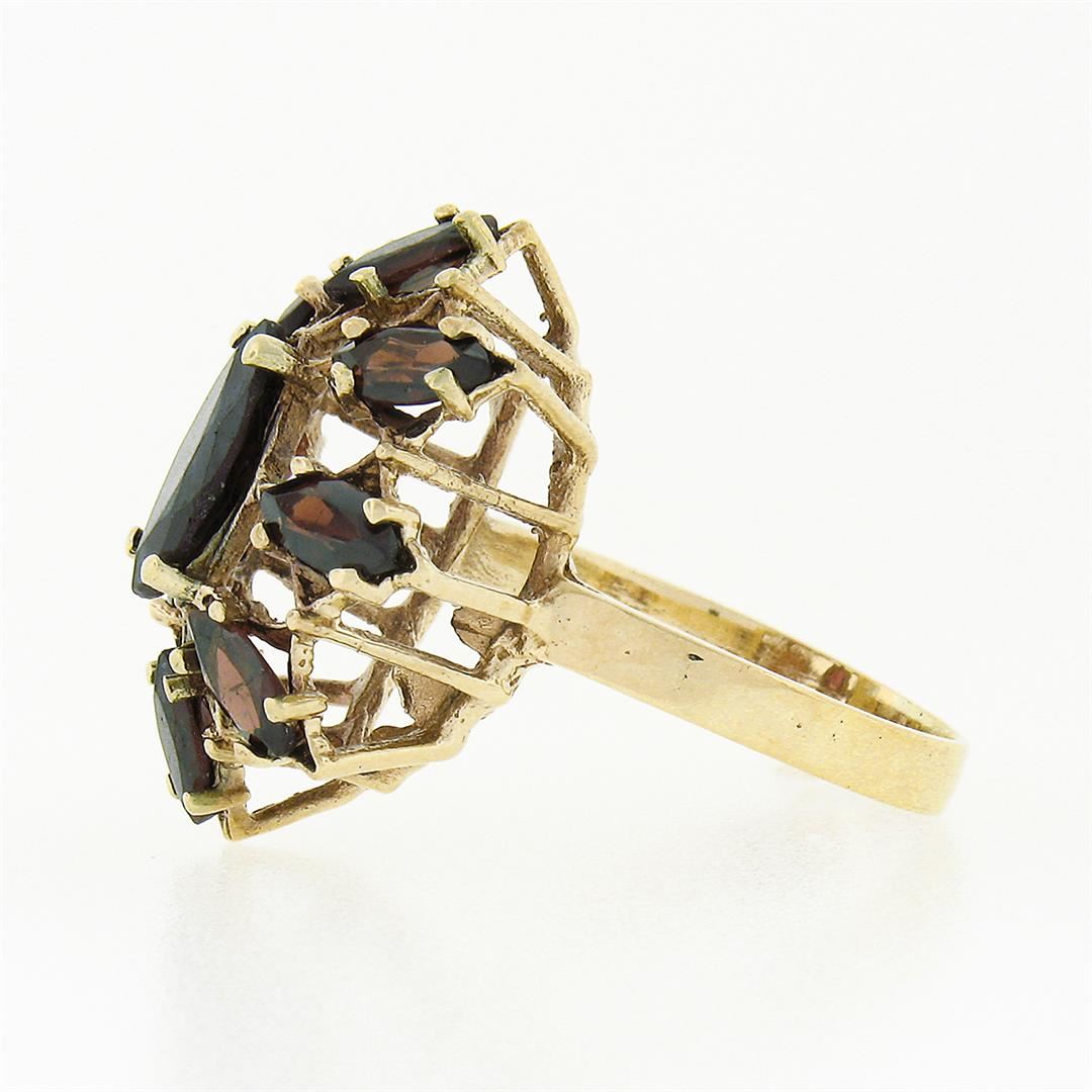 A solid 14k yellow gold flower cocktail ring, with 8 marquise cut natural garnets (3x6mm), and 1 marquise cut natural garnet (5x10mm). The ring is size 7.0, weighs a total of 4.54 grams, and measures 22.40mm wide.