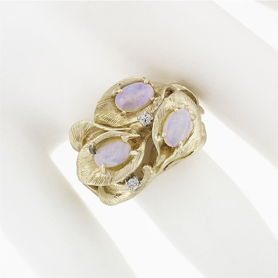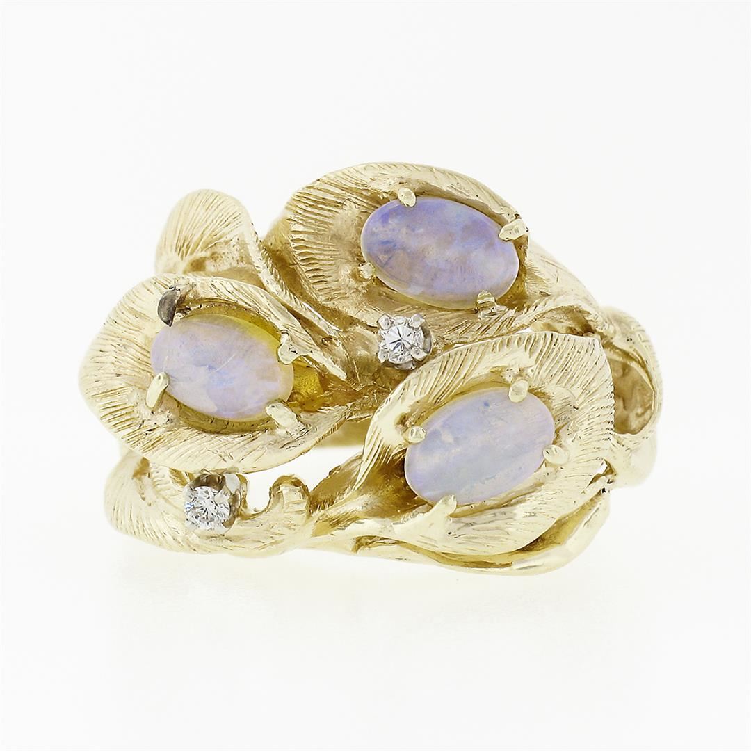 A vintage solid 14k yellow gold ring, with 2 round brilliant cut natural diamonds (G- VS1; 0.05ctw), & 3 oval cut natural opals (6x4mm). The ring is size 7.0, weighs a total of 10.25 grams, and measures 15.85mm wide.