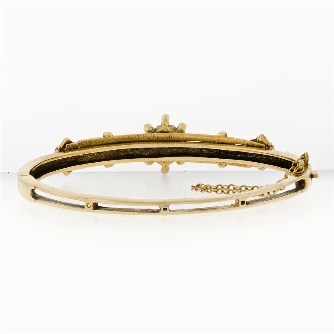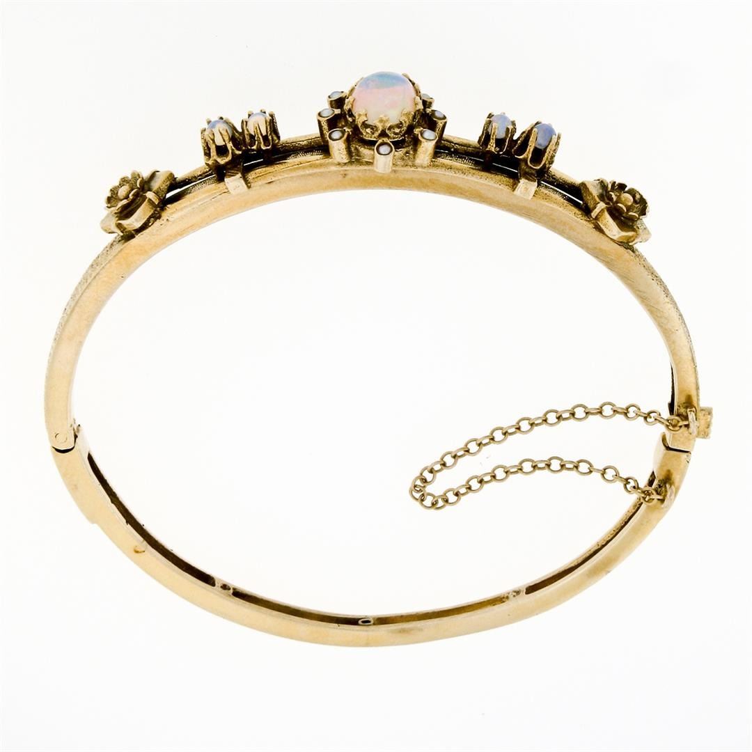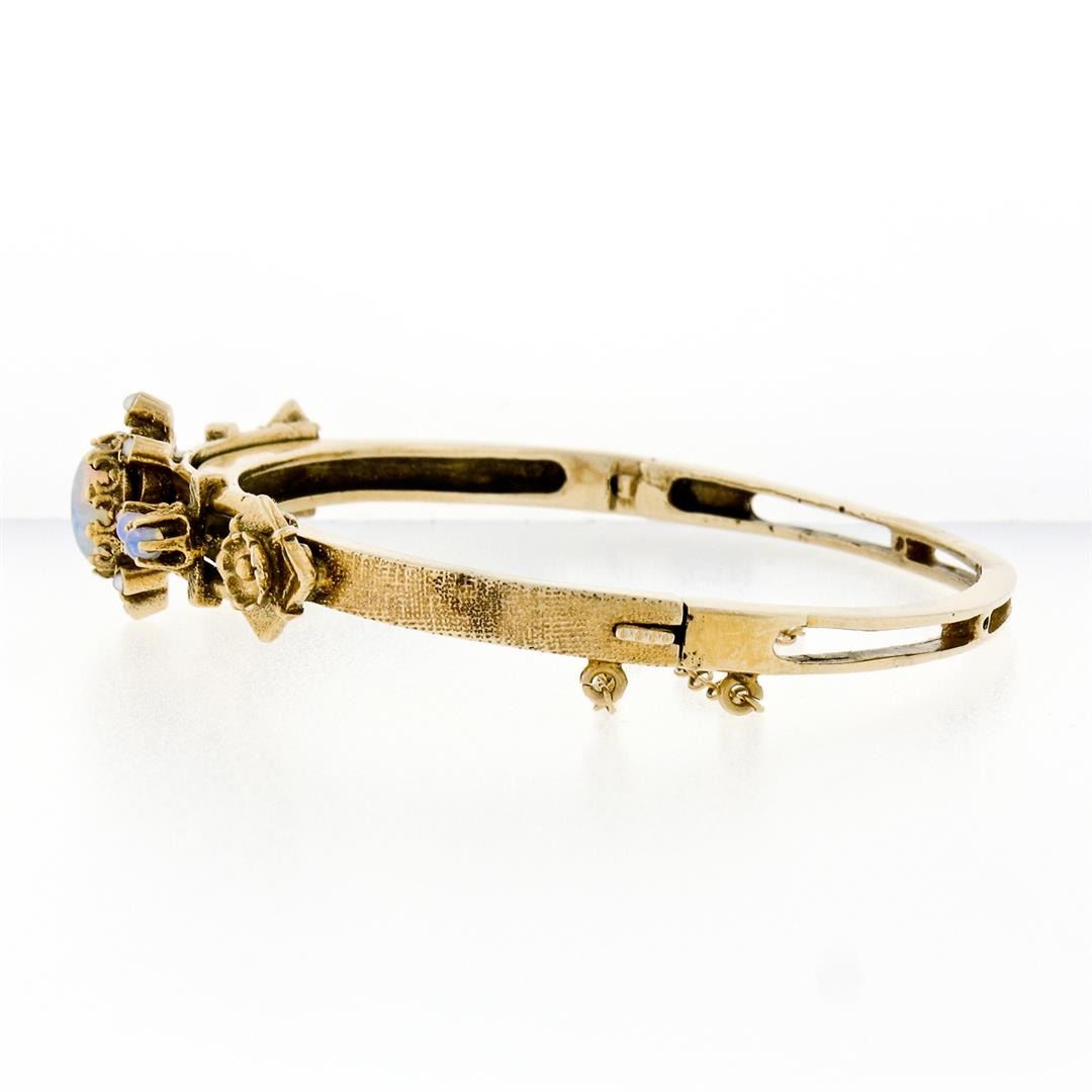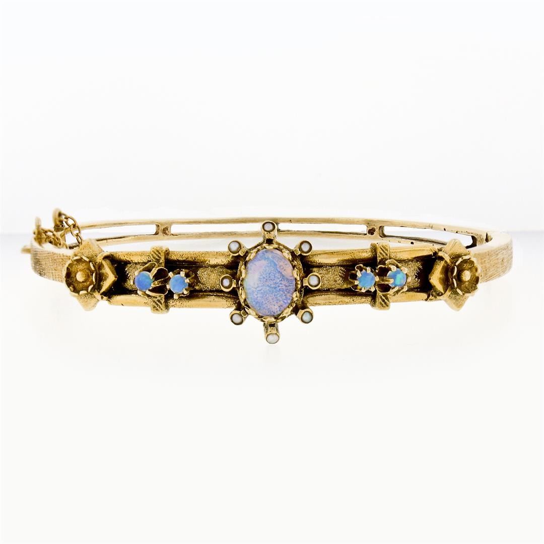 A vintage solid 14k yellow gold open hinged bangle bracelet, with 1 oval cabochon cut natural opal ( 7.5x5.8mm), and 4 round bead shape natural opals (2.25mm), and 8 round shape natural seed pearls (1.35mm). It weighs a total of 18.59 grams, measures 62.40mm wide, and measures 6.5 inches in length.