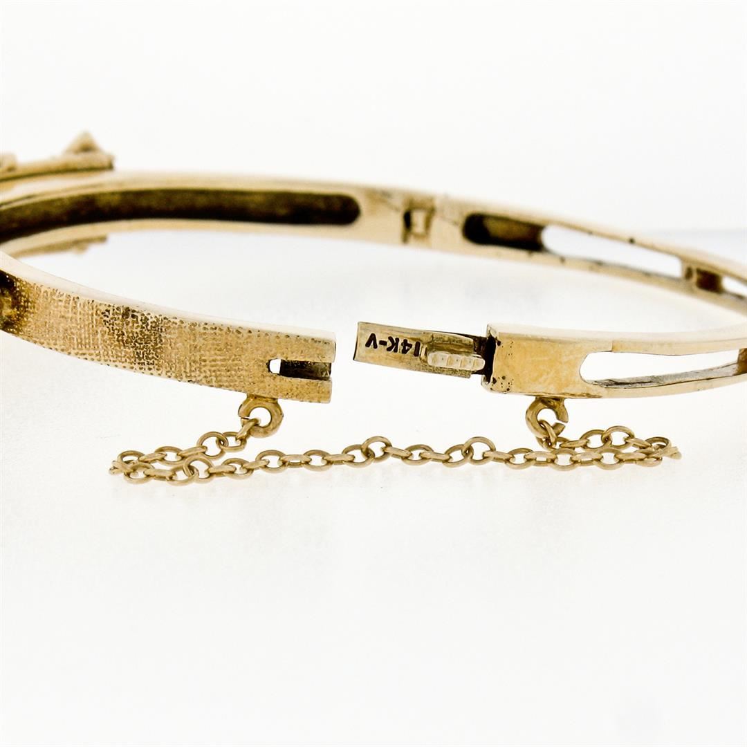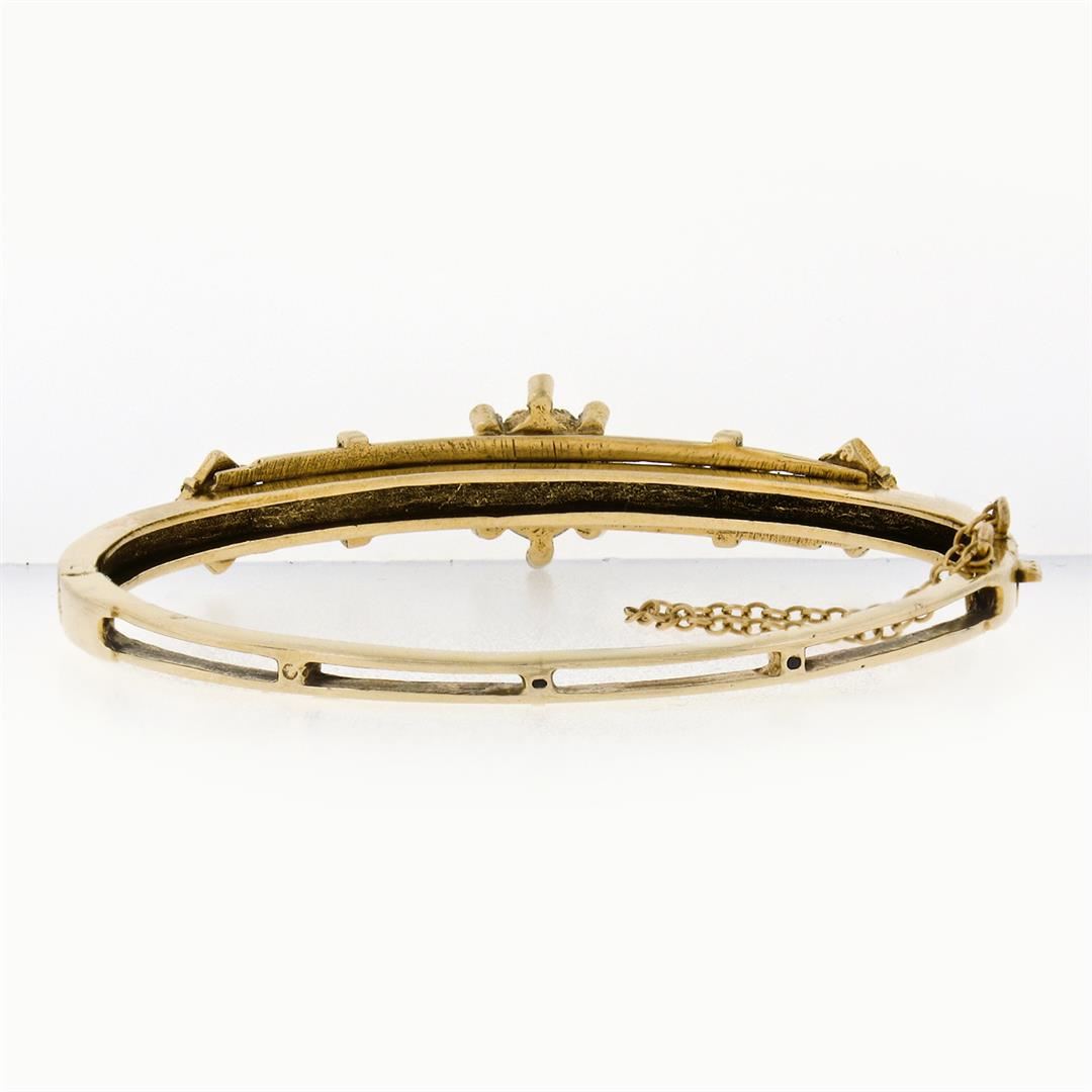 A vintage solid 14k yellow gold hinged bangle bracelet, with 1 oval cabochon cut natural opal (7.5x5.8mm), and 4 round bead shape natural opals (2.25mm), with 8 round bead shape natural seed pearls (1.35mm). It weighs a total of 18.59 grams, measures 62.40mm wide, and measures 6.5 inches in length.