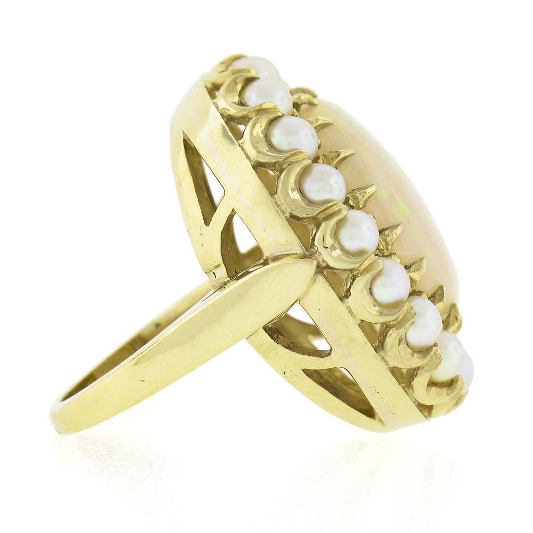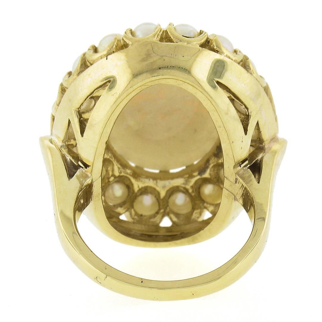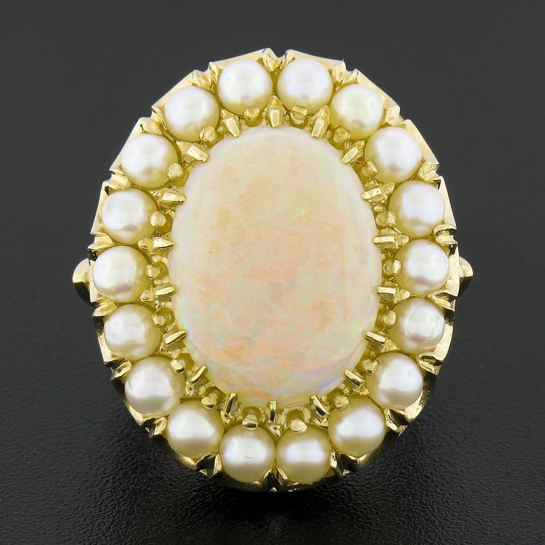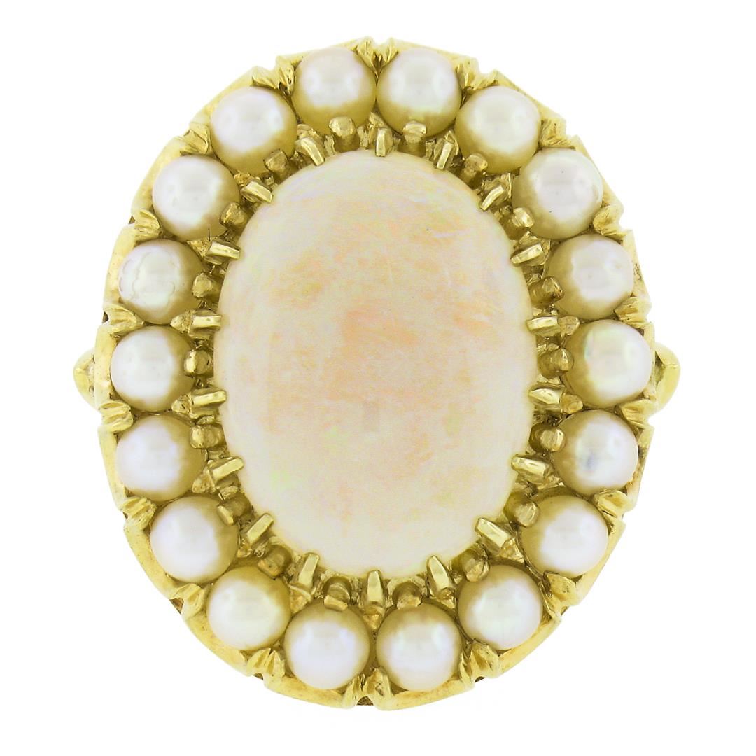 A vintage solid 14k yellow gold ring, with 1 oval cabochon cut natrual opal (16.3x12mm), surrounded with a halo of 18 bead shape cultured pearls (3 to 3.2mm). The ring is size 5.0, weighs a total of 11.27 grams, and measures 25.7mm wide.