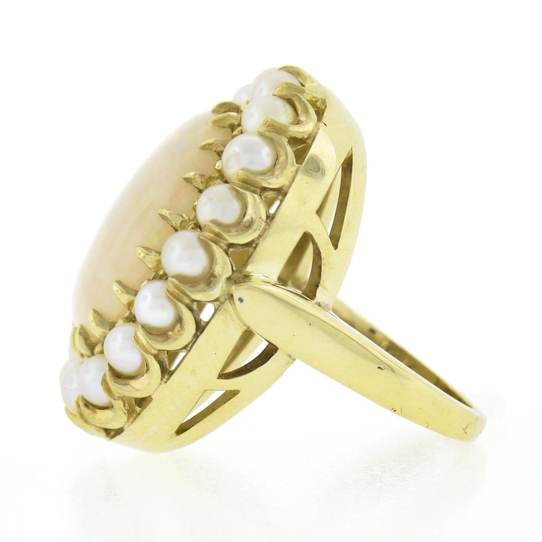 A vintage solid 14k yellow gold ring, with 1 oval cabochon cut natrual opal (16.3x12mm), surrounded with a halo of 18 bead shape cultured pearls (3 to 3.2mm). The ring is size 5.0, weighs a total of 11.27 grams, and measures 25.7mm wide.