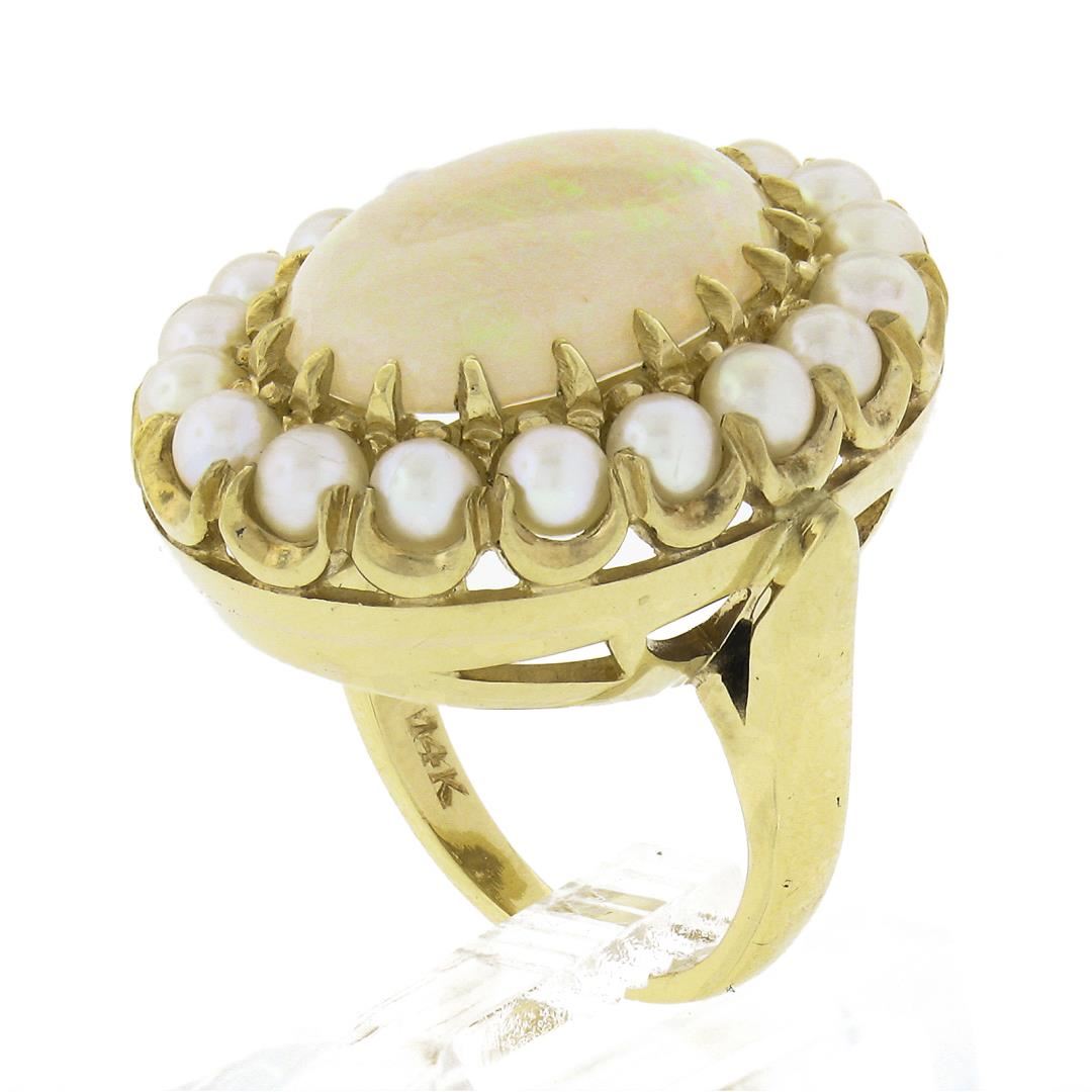 A vintage solid 14k yellow gold ring, with 1 oval cabochon cut natrual opal (16.3x12mm), surrounded with a halo of 18 bead shape cultured pearls (3 to 3.2mm). The ring is size 5.0, weighs a total of 11.27 grams, and measures 25.7mm wide.