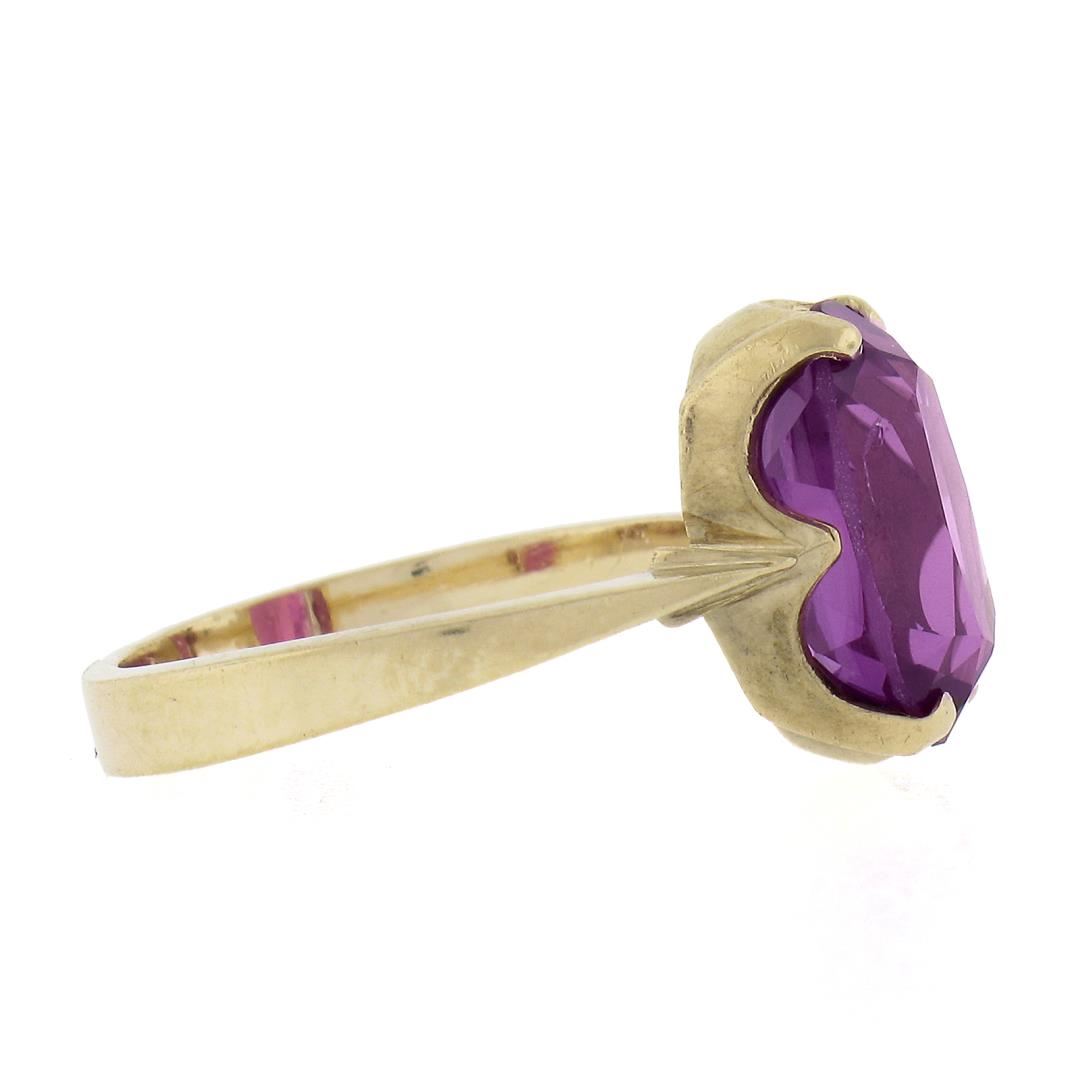 A vintage solid 14k yellow gold solitaire ring, with 1 oval cut pink stone (11.8x7.8mm). The ring is size 6.5, weighs a total of 3.79 grams, and measures 12.1mm wide.