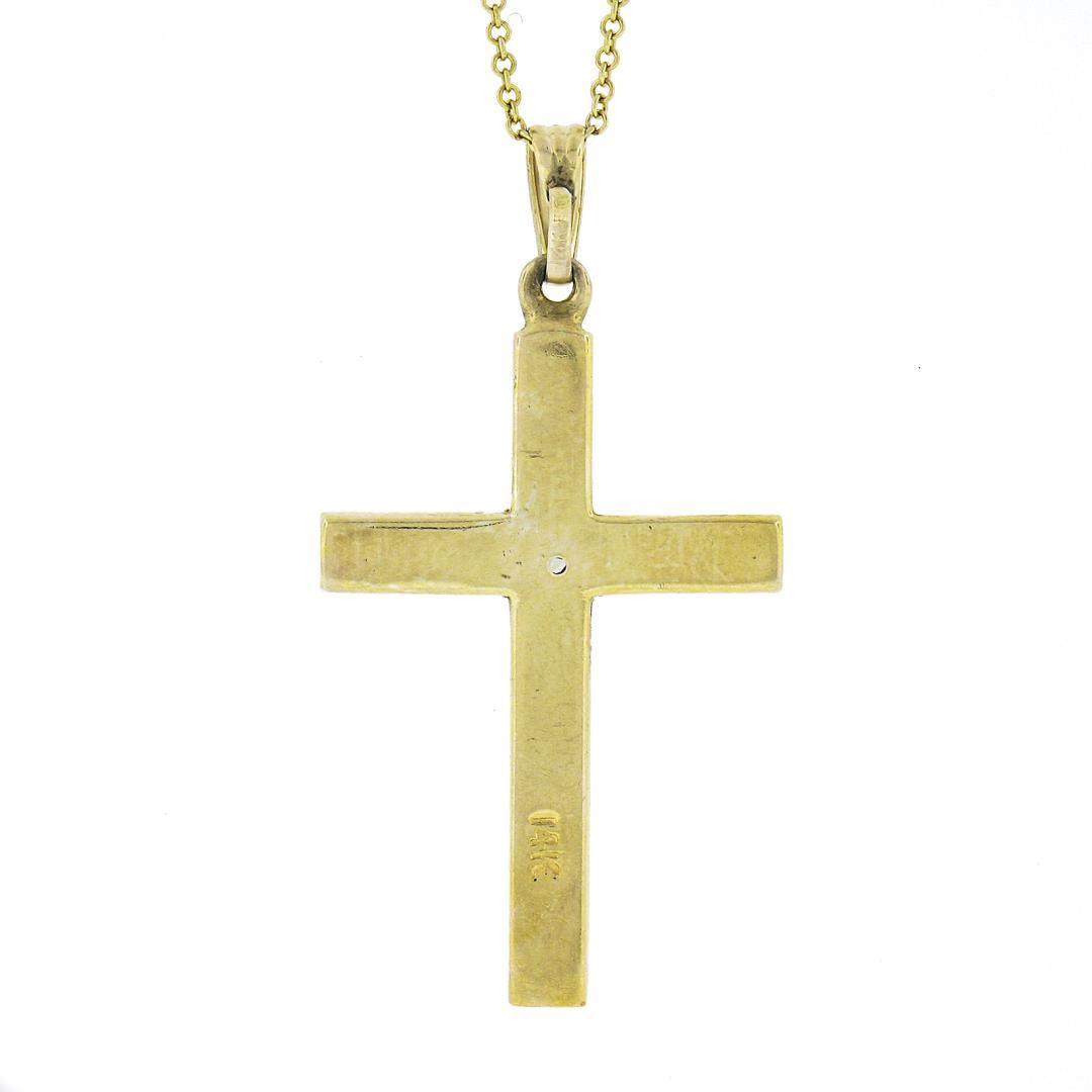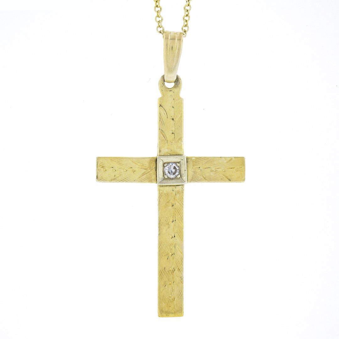 A vintage solid 14k yellow gold cross pendant necklace, with 1 old single cut natural diamond ( H - SI1 ; 0.03ctw). Adjustable at 18 & 20 inch cable link chain, 3.09 grams total weight, pendant measures 38.9x20.5mm.