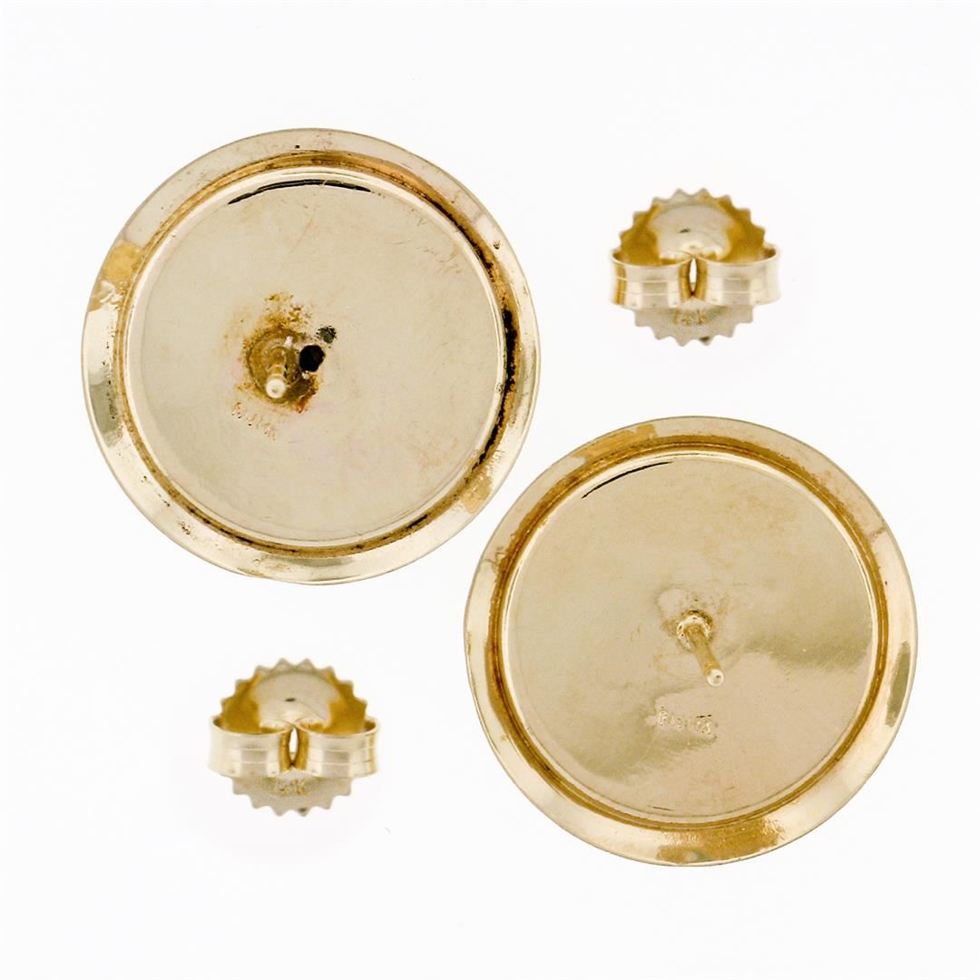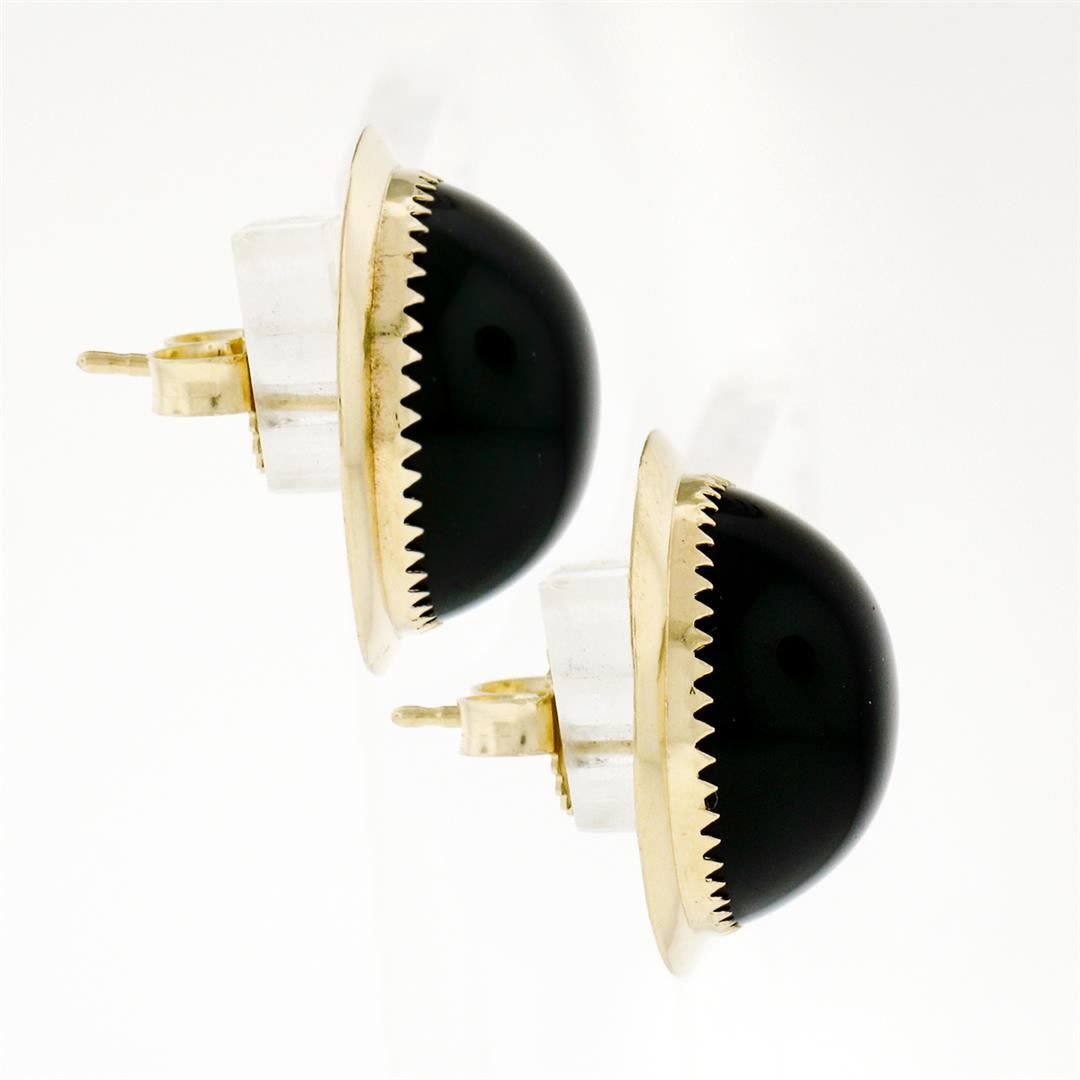 A vintage solid 14k yellow gold button earrings, with 2 round cabochon cut natural black onyx (7.40mm). The earrings measure approximately 9.15mm in diameter and weigh a total of 6.44 grams.