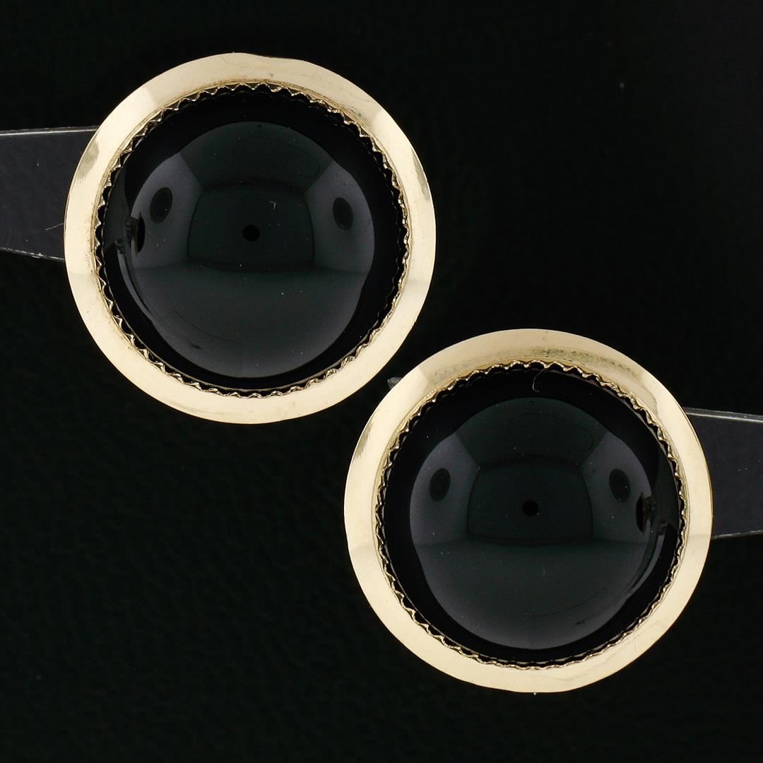 A vintage solid 14k yellow gold button earrings, with 2 round cabochon cut natural black onyx (7.40mm). The earrings measure approximately 9.15mm in diameter and weigh a total of 6.44 grams.