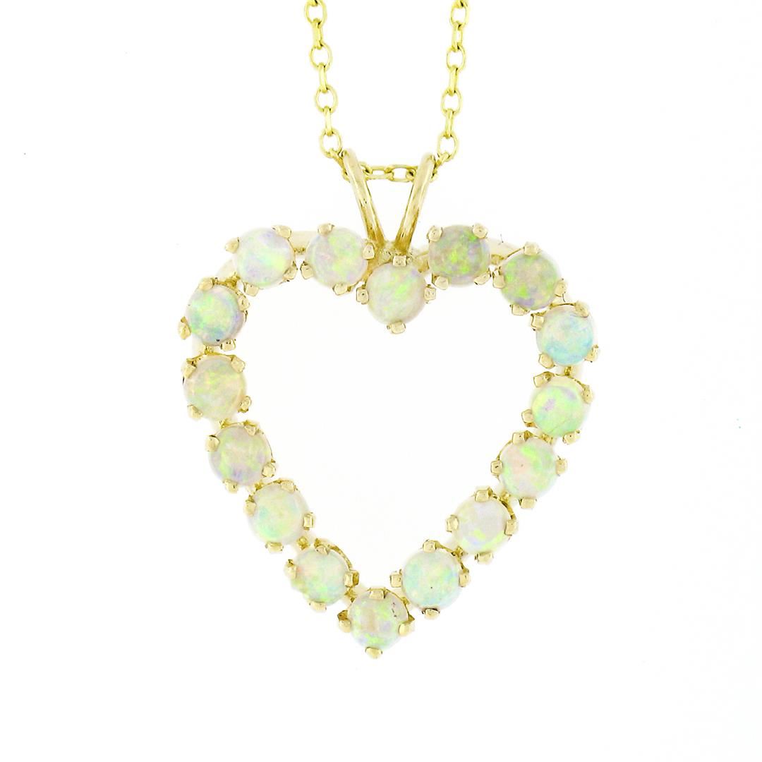 A vintage solid 14k yellow gold heart pendant necklace, with 16 round cabochon cut natural opals (2.3mm). 16 inch cable link chain, 3.0 grams total weight, pendant measures 19.50x16mm.