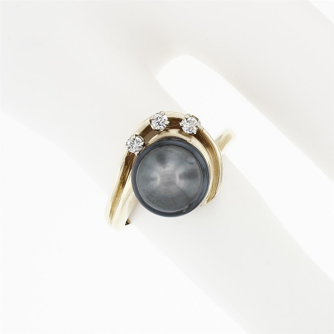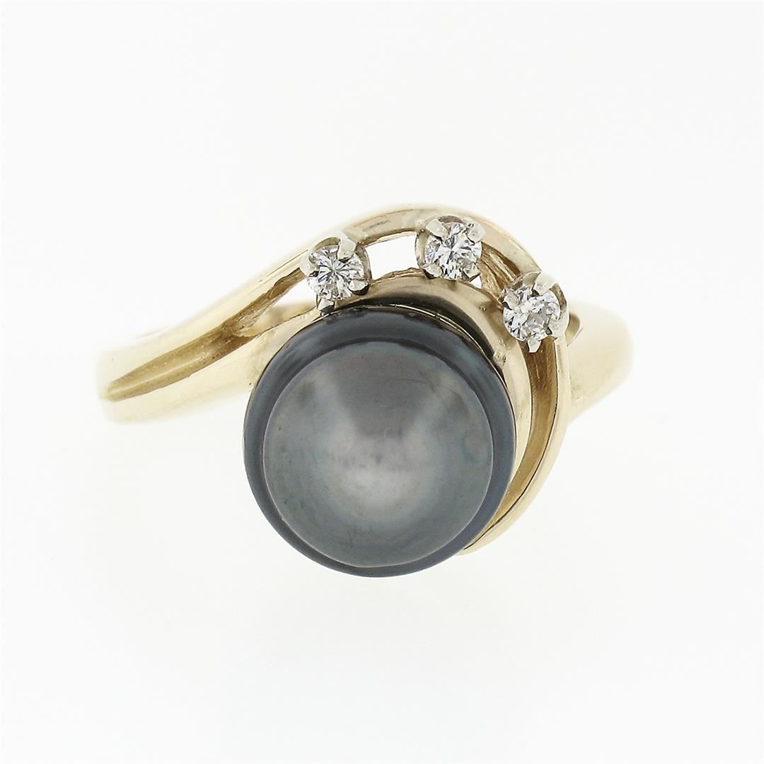 A vintage solid 14k yellow gold ring, with 1 unique shape cultured pearl (9.1mm), & 3 round brilliant cut natural diamonds (G/H- VS2; 0.09ctw ). The ring is size 4.5, weighs a total of 5.46 grams, and measures 12.25mm wide.