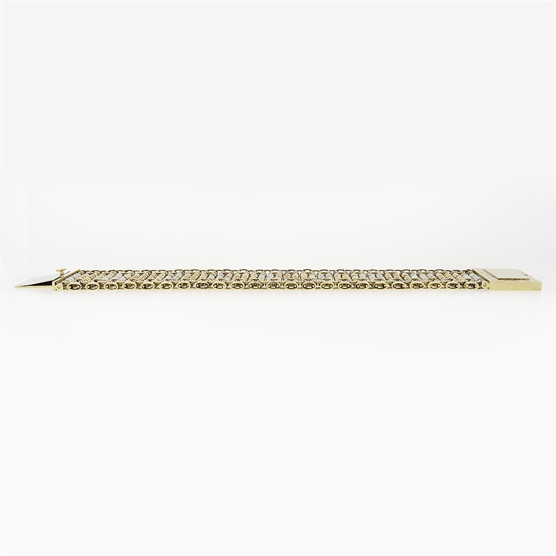 A vintage solid 14k yellow gold wide strap bracelet, with numerous of round shape cultures pearls (2.5 to 3mm ). It weighs a total of 61.50 grams, measures 31mm wide, and measures 6.75 inches in length.