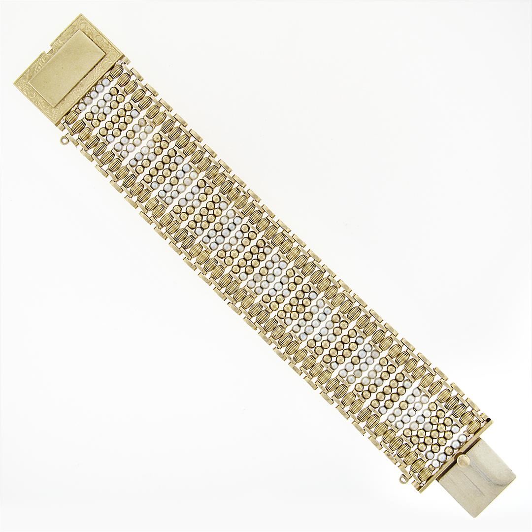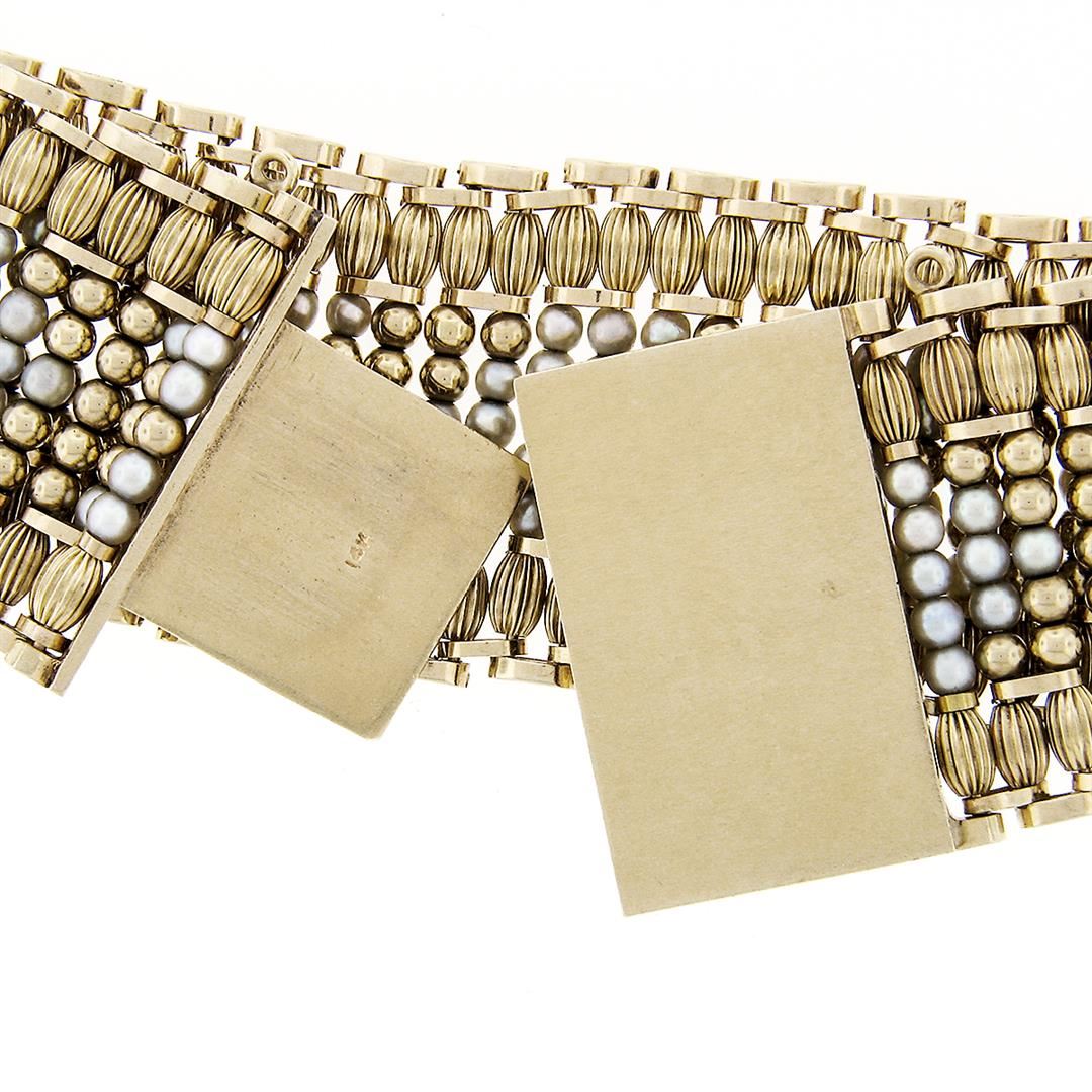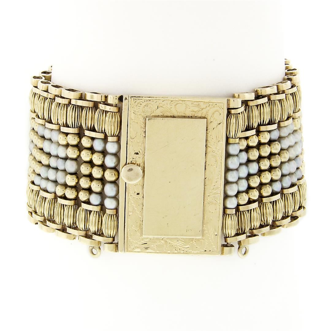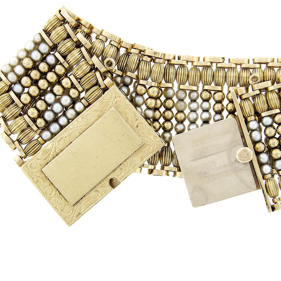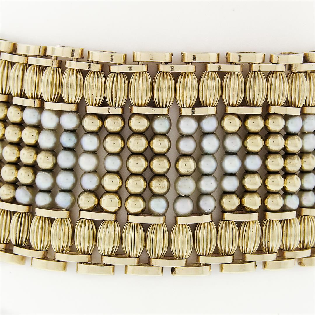 A vintage solid 14k yellow gold wide strap bracelet, with numerous of round shape cultures pearls (2.5 to 3mm ). It weighs a total of 61.50 grams, measures 31mm wide, and measures 6.75 inches in length.