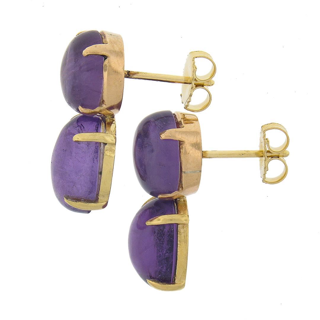 A vintage solid 14k yellow gold earrings, with 2 round & 2 oval cabochon cut natrual amethysts (10.5mm & 11.5x10mm). The earrings measure approximately 22.6x10.6mm and weigh a total of 6.97 grams.