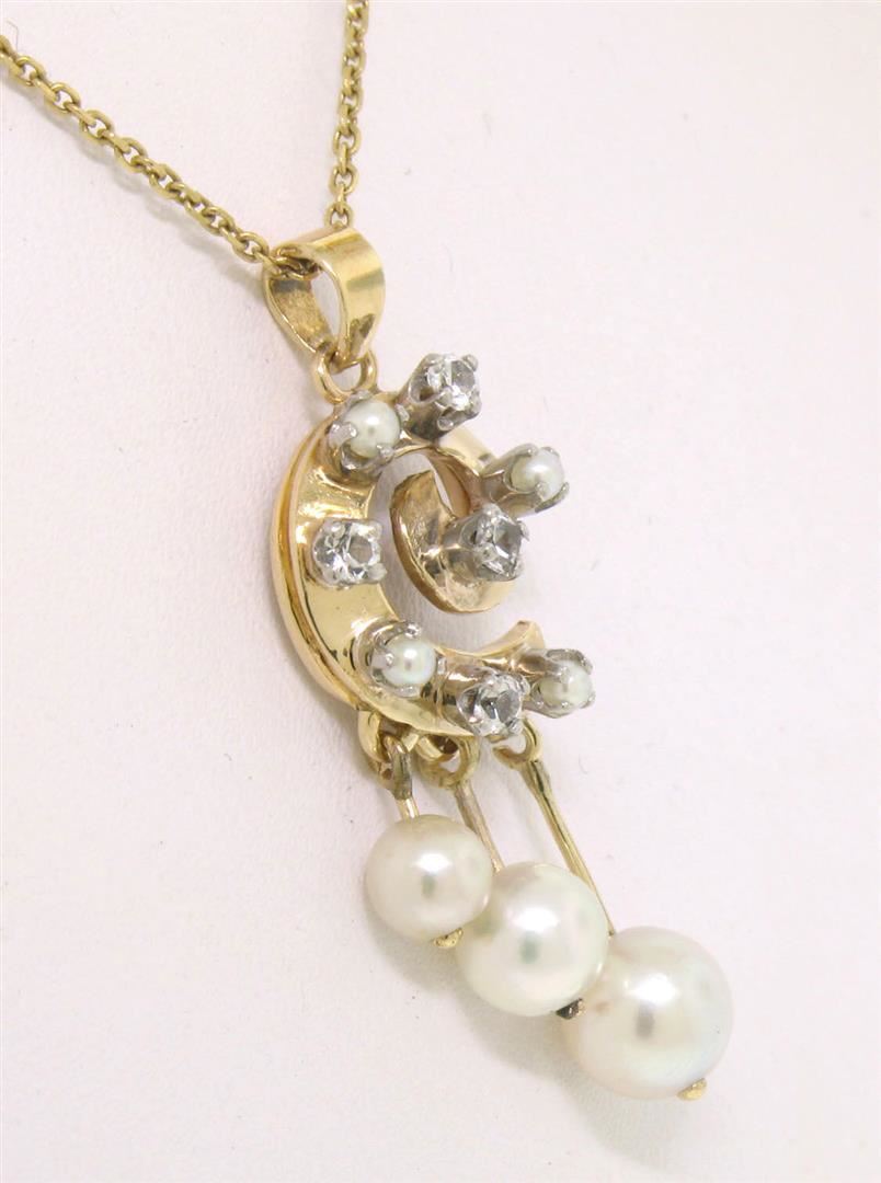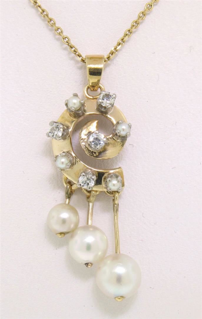 A vintage solid 14k yellow gold spiral dangle pendant necklace, with 4 round single cut natural diamonds (F- VS1 ; 0.20ctw), alternated with 4 round shape natural seed pearls (2.0mm), and 3 dangle round shape natural akoya pearls (4.45mm, 5.62mm, and 6.50mm). The pendant weighs a total of 4.6 grams, measures 34.48x13.54mm including the bail, and 16 inch cable link chain.