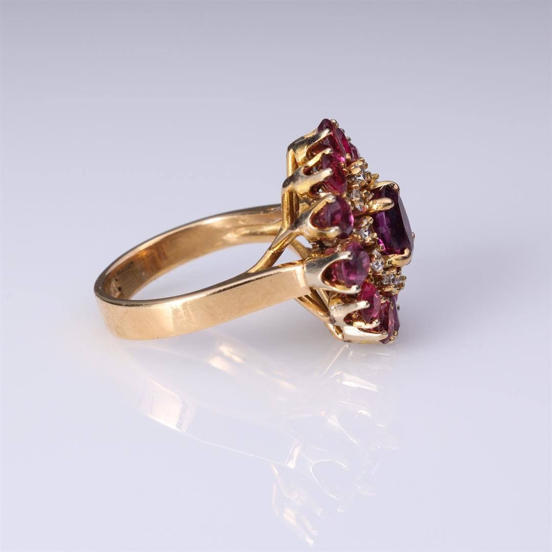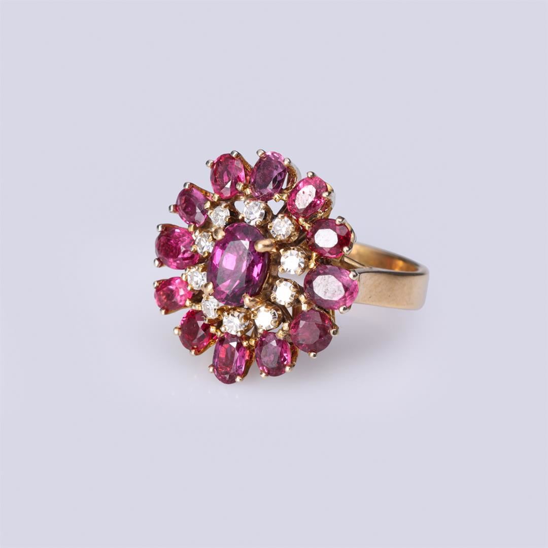 Vintage 14K Yellow Gold Ruby & Diamond Cluster Ring containing thirteen oval rubies weighing approximately 2.60 cts. Ten round cut brilliant diamonds weighing approximately 0.25 cts. Total weight of ring is 7.3 gm. Estimated retail value $3,000.