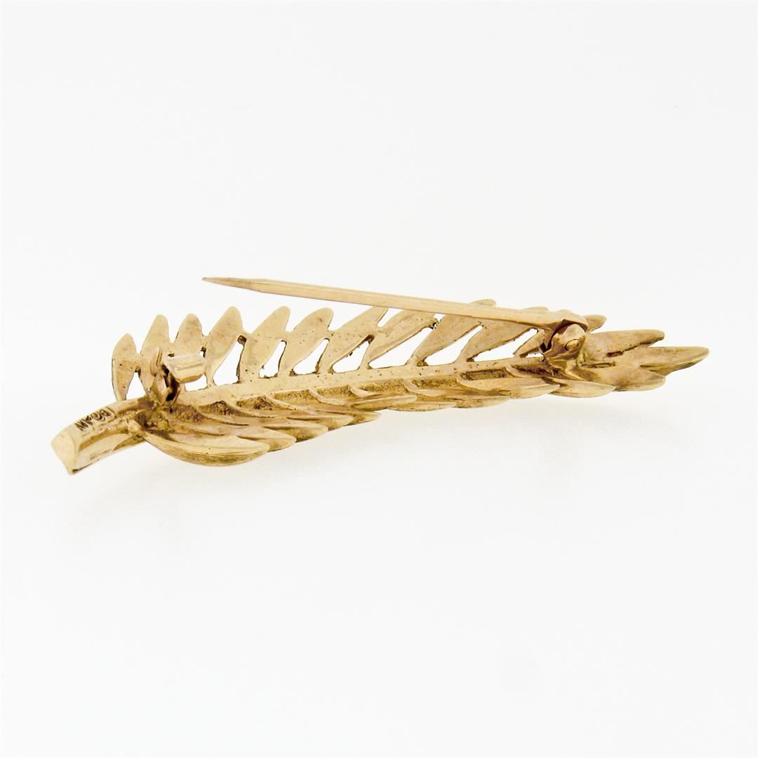 A vintage solid 14k yellow gold feather brooch, with 26 round shape natural seed pearls (0.65 - 1.75mm). Measures 19.35x51.25mm and weighs a total of 6.72 grams.