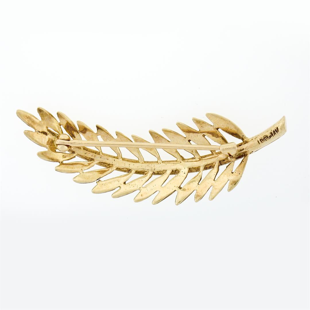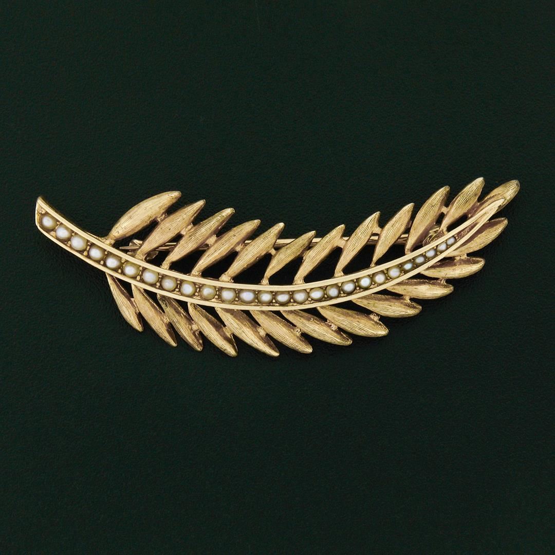 A vintage solid 14k yellow gold feather brooch, with 26 round shape natural seed pearls (0.65 - 1.75mm). Measures 19.35x51.25mm and weighs a total of 6.72 grams.