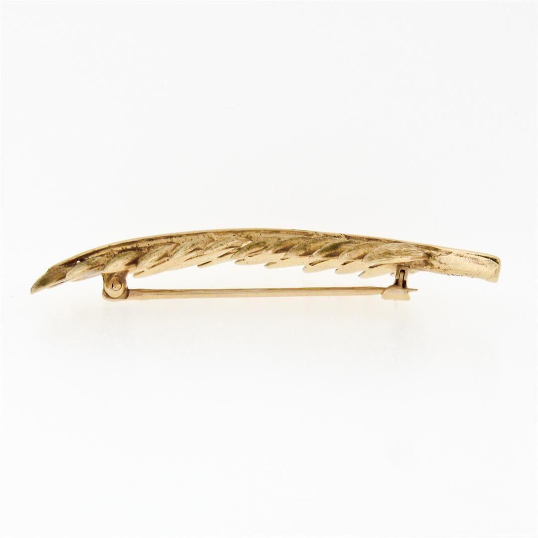 A vintage solid 14k yellow gold feather brooch, with 26 round shape natural seed pearls (0.65 - 1.75mm). Measures 19.35x51.25mm and weighs a total of 6.72 grams.