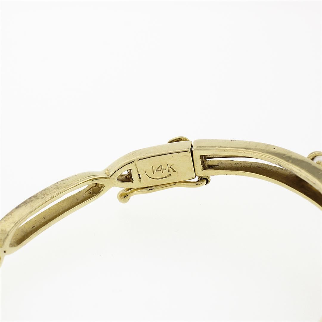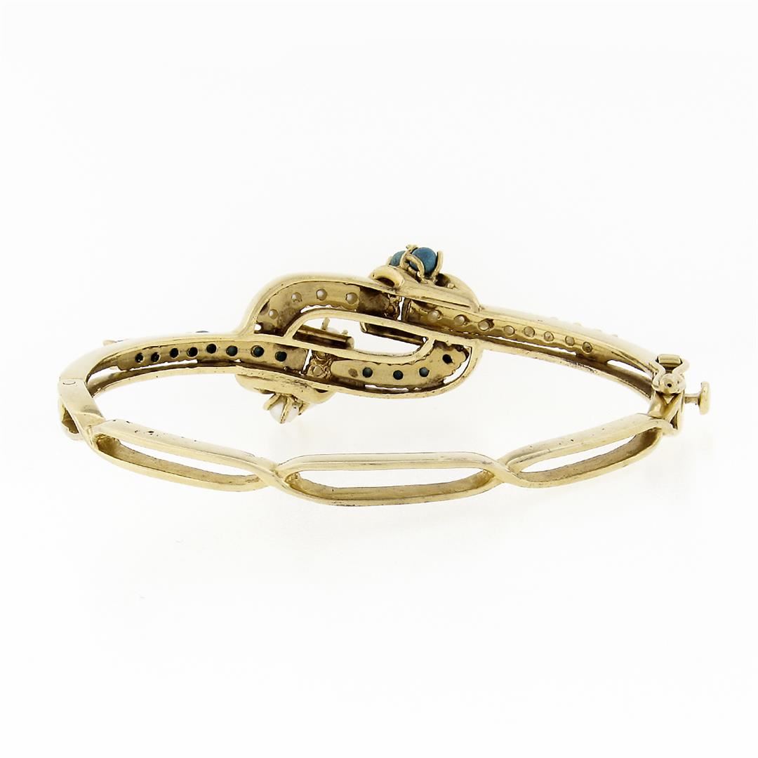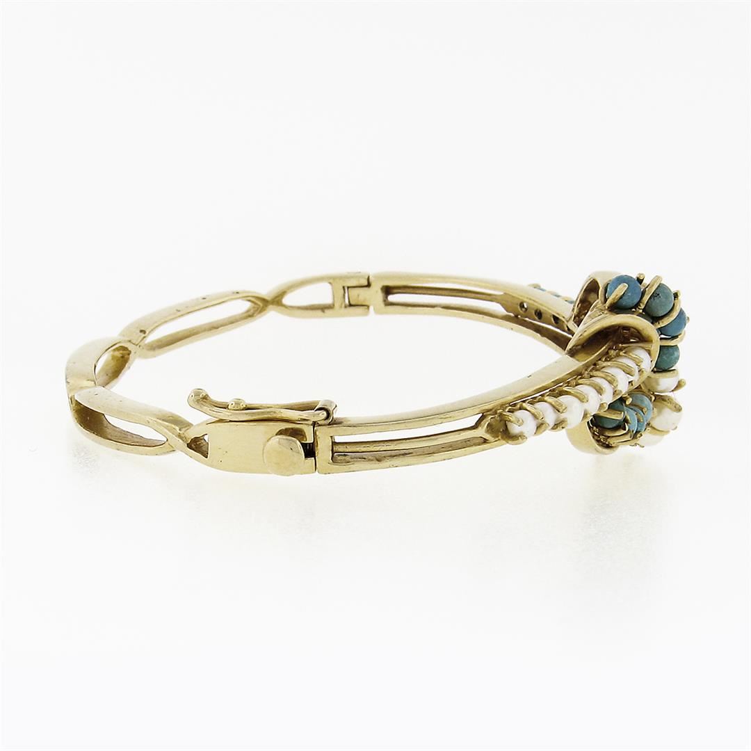 A vintage solid 14k yellow gold knot hinged bracelet, with 16 bead shape natural turquoise (2.6 to 3.0mm), & 16 round shape natural cultured pearls (2.4 to 3.2mm). It weighs a total of 21.05 grams, measures 21mm wide, and measures 6.25 inches in length.