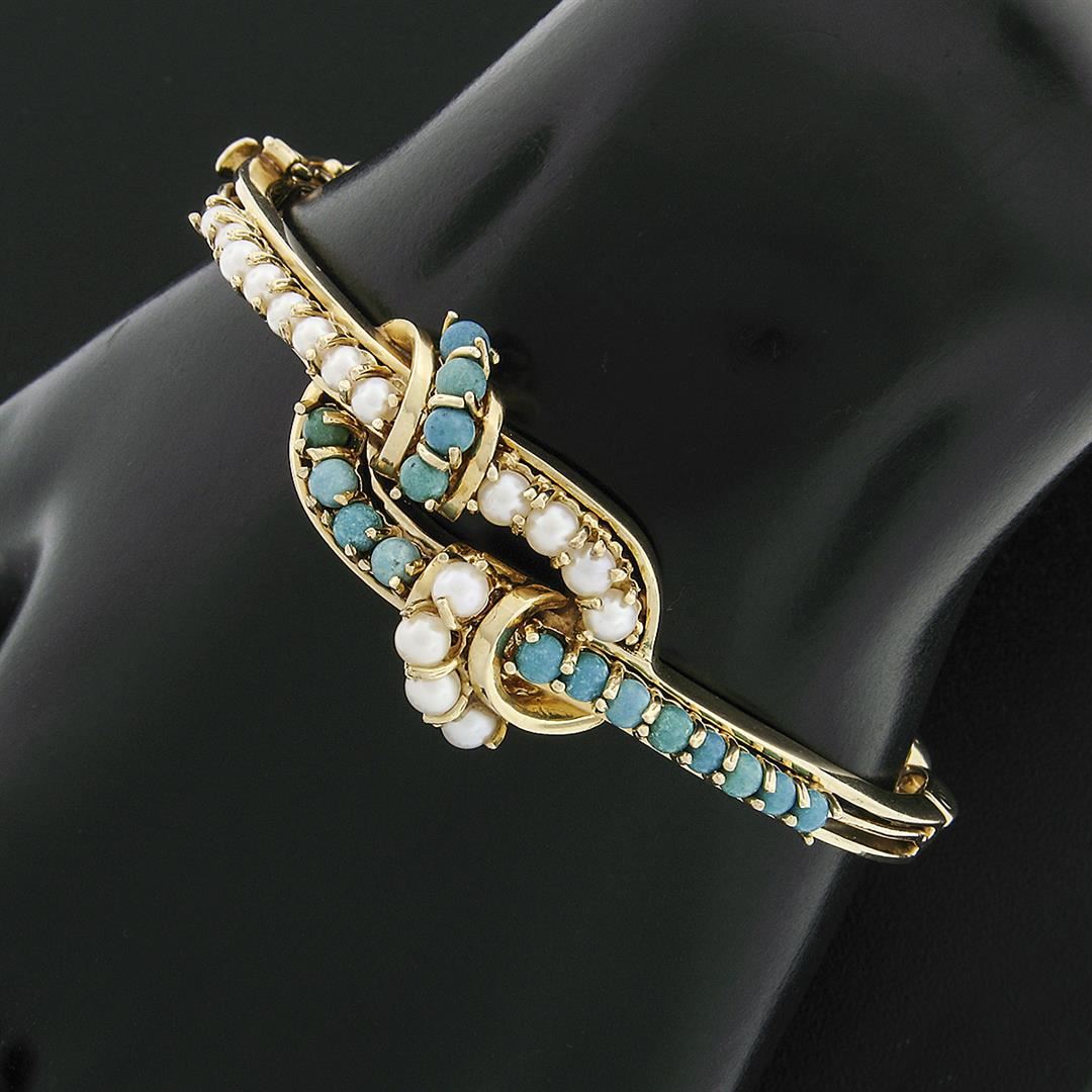 A vintage solid 14k yellow gold knot hinged bracelet, with 16 bead shape natural turquoise (2.6 to 3.0mm), & 16 round shape natural cultured pearls (2.4 to 3.2mm). It weighs a total of 21.05 grams, measures 21mm wide, and measures 6.25 inches in length.