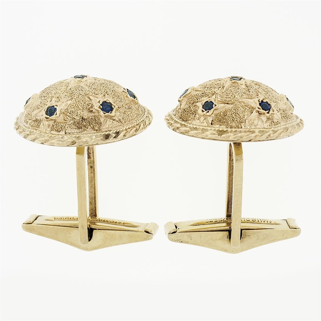 A solid 14k yellow gold star puffed cufflinks, with 14 round cut natural sapphires (0.30ctw). These cuff links have a swivel design with a clearance of 13.85mm, weigh a total of 14.89 grams, and the front panels measure 19.90mm in diameter.
