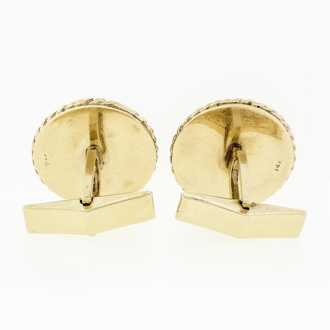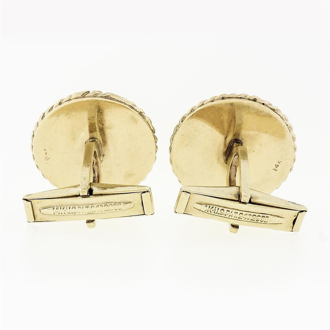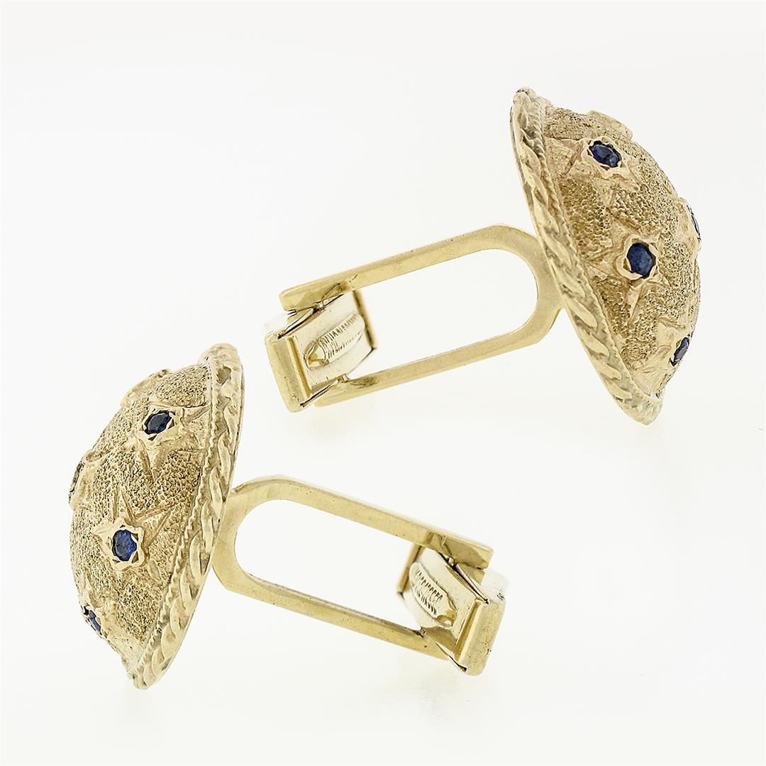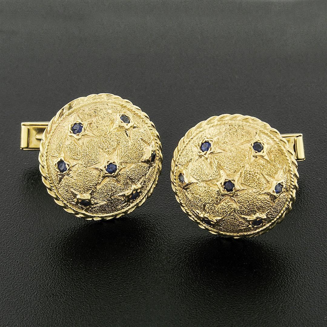 A solid 14k yellow gold star puffed cufflinks, with 14 round cut natural sapphires (0.30ctw). These cuff links have a swivel design with a clearance of 13.85mm, weigh a total of 14.89 grams, and the front panels measure 19.90mm in diameter.