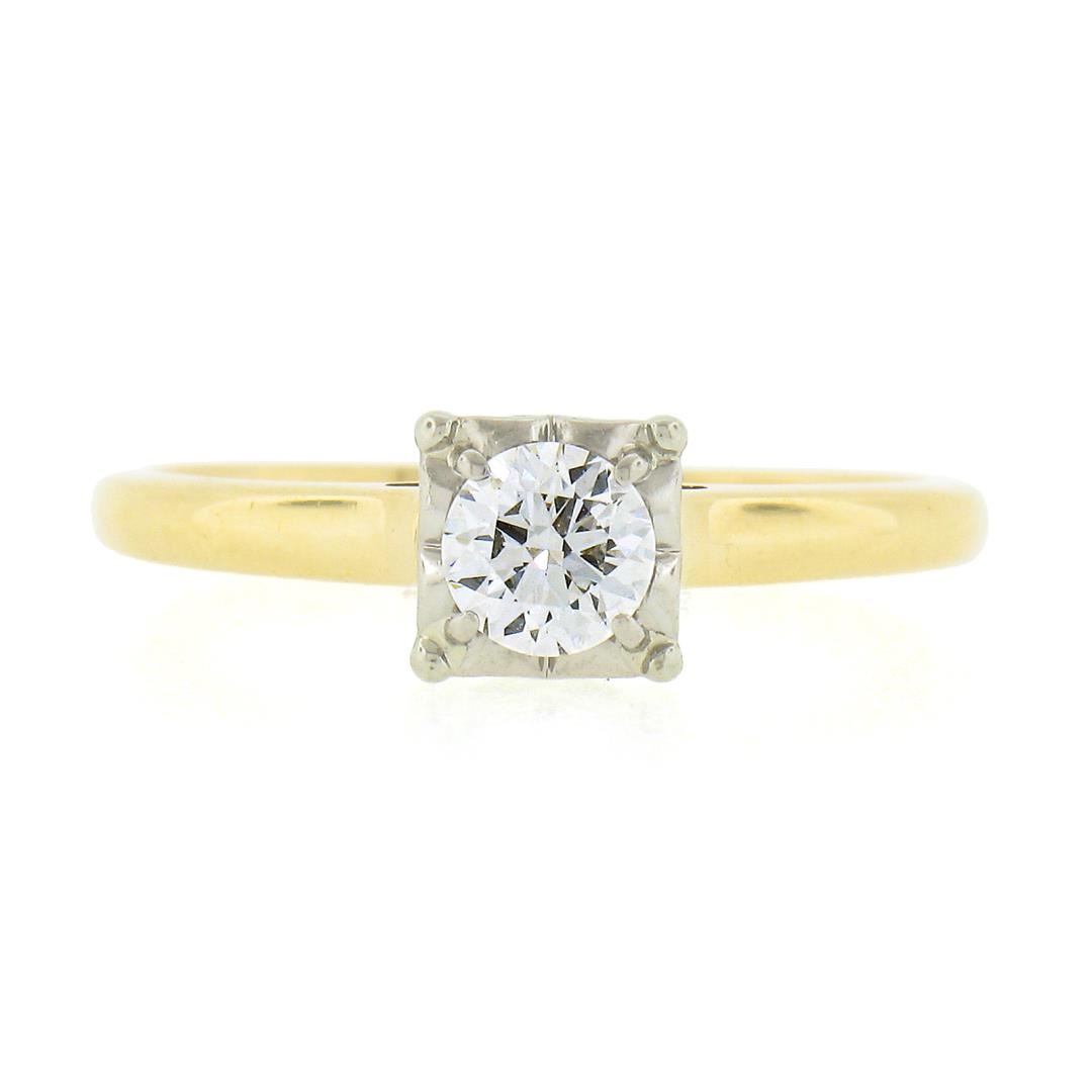 A vintage solid 14k yellow & white gold soliatire engagement ring, with 1 old transitional cut natural diamond (F - VS2 ; 0.38ct). The ring is size 7.5, weighs a total of 2.91 grams, and measures 5.9mm wide.