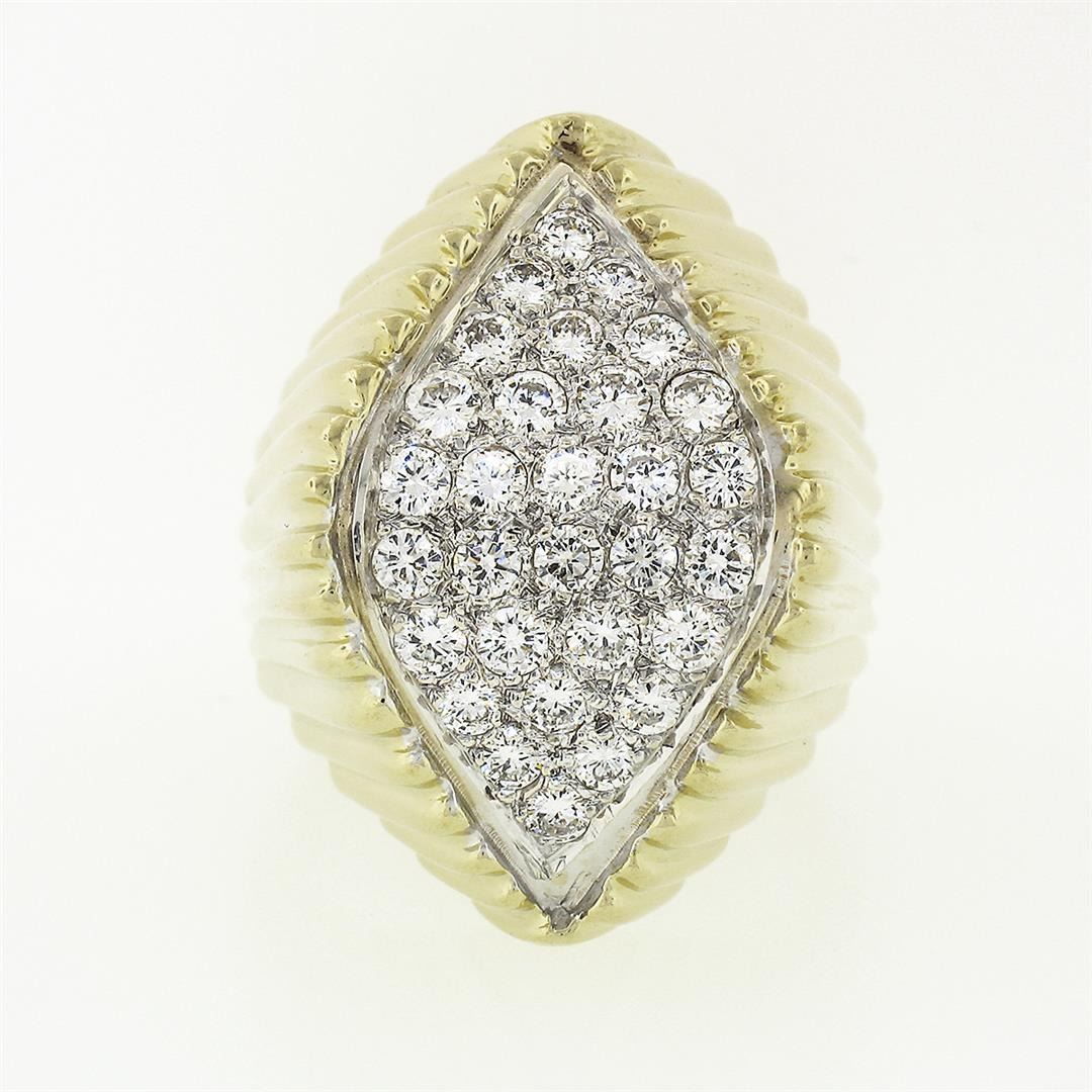 A vintage solid 14k yellow & white gold cocktail ring, with 30 round brilliant cut natural diamonds (F/G- VVS2/VS1 ; 1.20 ctw). The ring is size 7, weighs a total of 12.94 grams, and measures 26.1mm wide.