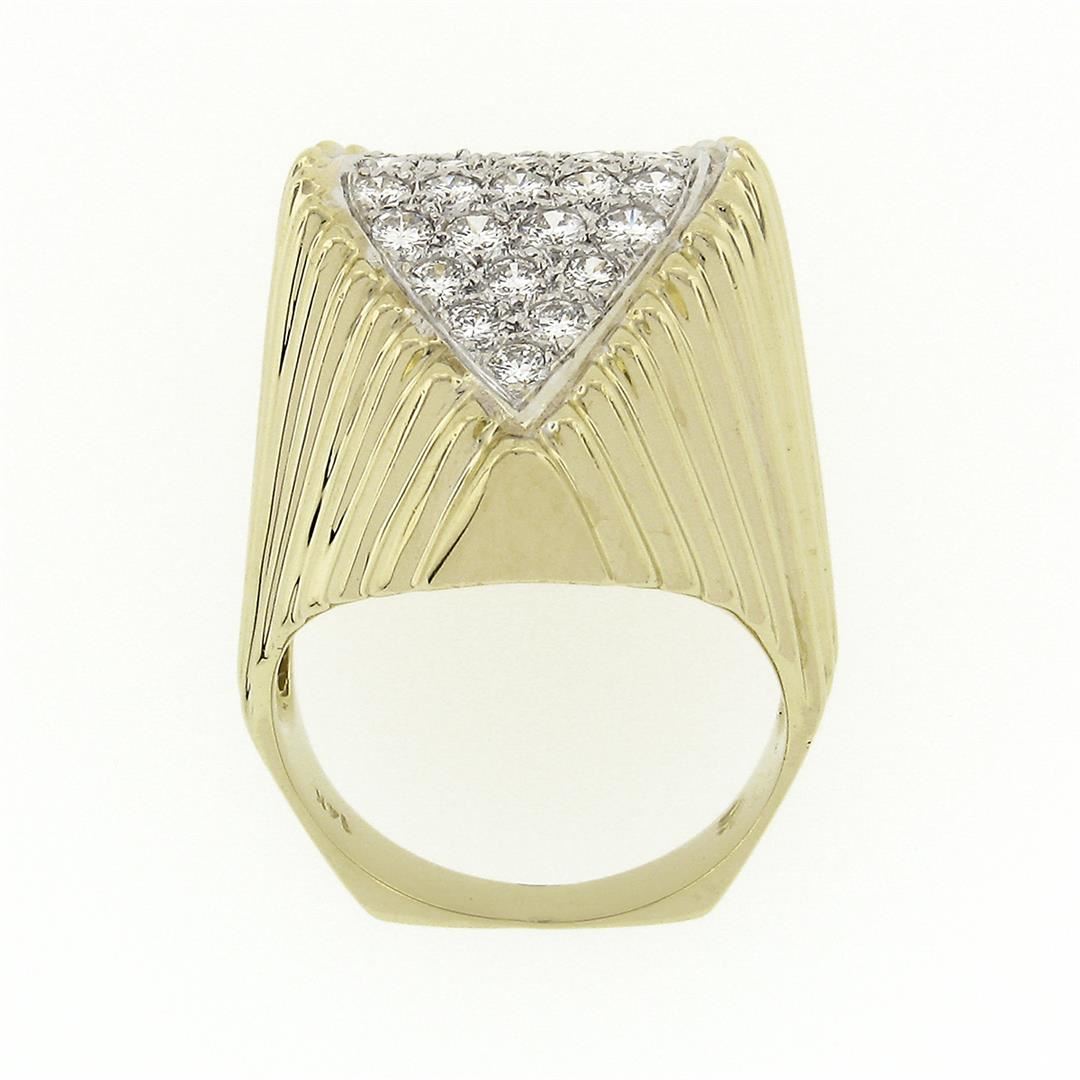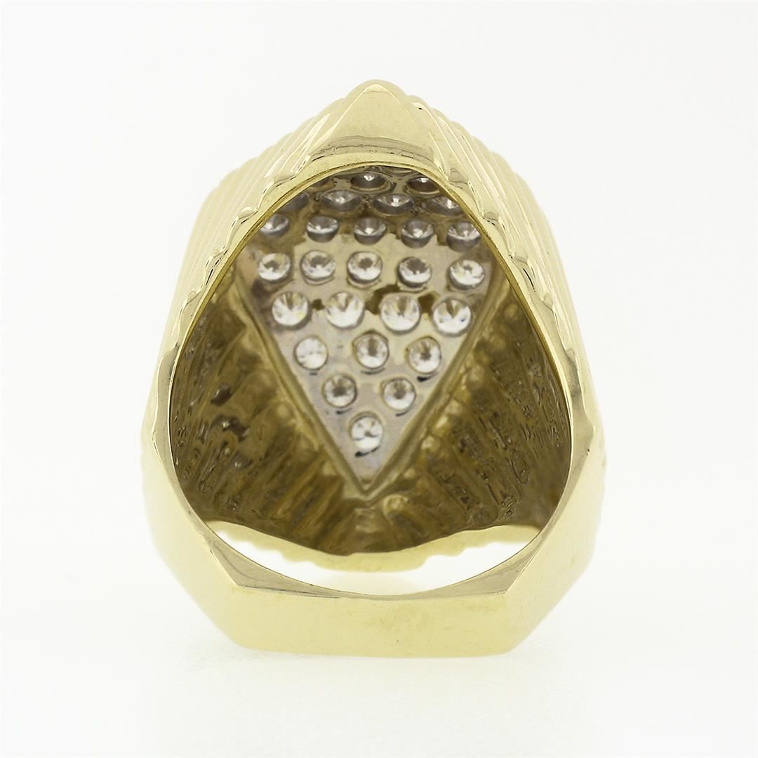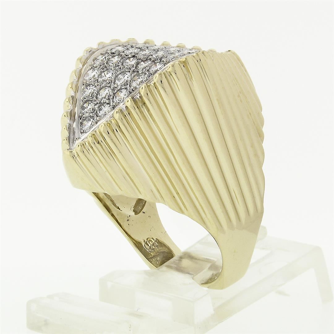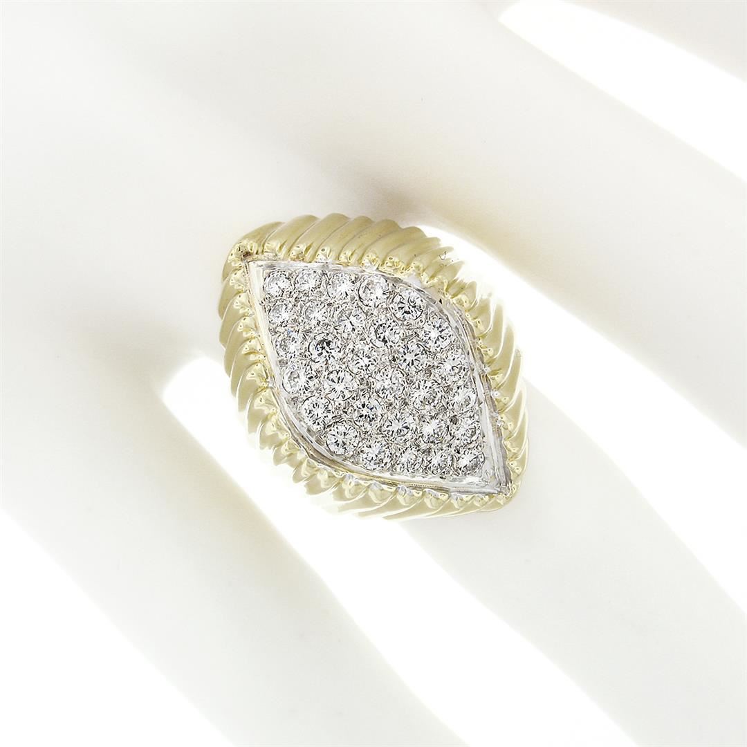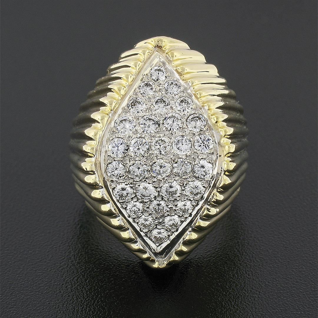 A vintage solid 14k yellow & white gold cocktail ring, with 30 round brilliant cut natural diamonds (F/G- VVS2/VS1 ; 1.20 ctw). The ring is size 7, weighs a total of 12.94 grams, and measures 26.1mm wide.