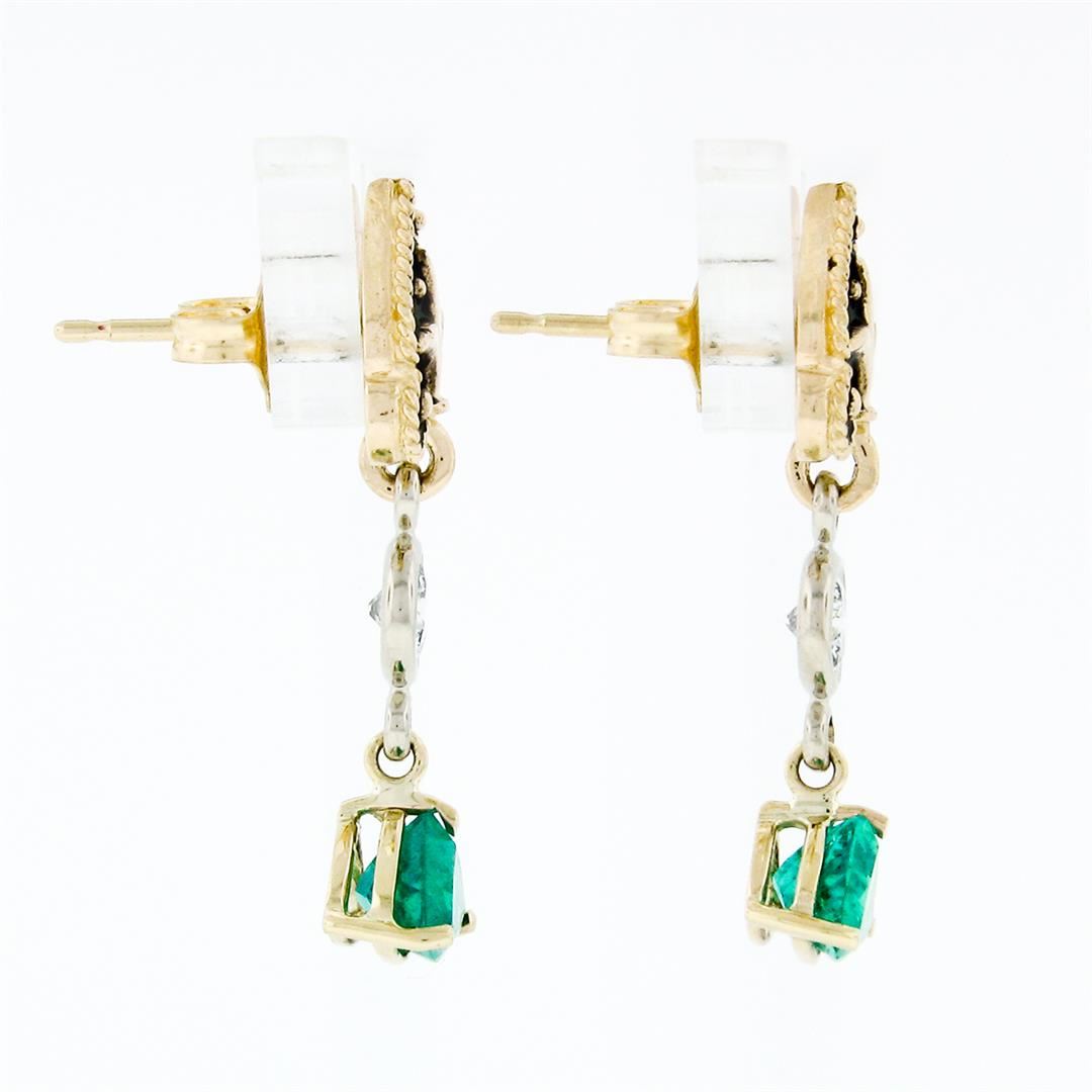 A vintage solid 14k yellow gold pain on floral dangle earrings, with enamel work and 2 trillion cut natural colombian emerald (0.98ctw), and 2 round brilliant cut natural diamonds (F/G - VS2/SI1 ; 0.30ctw). The earrings measure approximately 25.5x9.2mm and weigh a total of 3.0 grams.