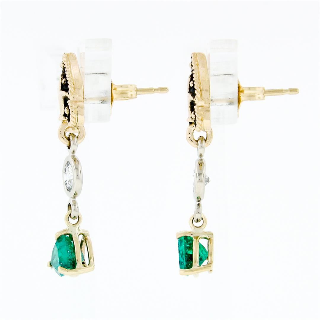 A vintage solid 14k yellow gold pain on floral dangle earrings, with enamel work and 2 trillion cut natural colombian emerald (0.98ctw), and 2 round brilliant cut natural diamonds (F/G - VS2/SI1 ; 0.30ctw). The earrings measure approximately 25.5x9.2mm and weigh a total of 3.0 grams.