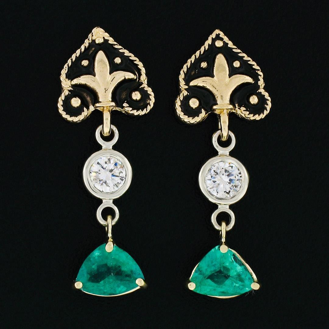 A vintage solid 14k yellow gold pain on floral dangle earrings, with enamel work and 2 trillion cut natural colombian emerald (0.98ctw), and 2 round brilliant cut natural diamonds (F/G - VS2/SI1 ; 0.30ctw). The earrings measure approximately 25.5x9.2mm and weigh a total of 3.0 grams.