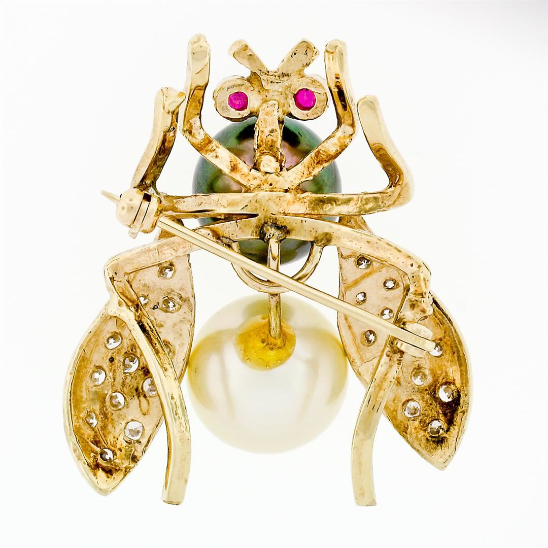 A vintage solid 14k yellow gold bee pin brooch, with 1 round tahitian pearl (11.2mm), 1 round cultured pearl (12.2mm ), 2 round brilliant rubies (0.14ctw), and 26 round brilliant natural diamonds (E/F - VVS2/VS1 ; 1.30ctw). Measures 35x30.8mm and weighs a total of 12.77 grams.