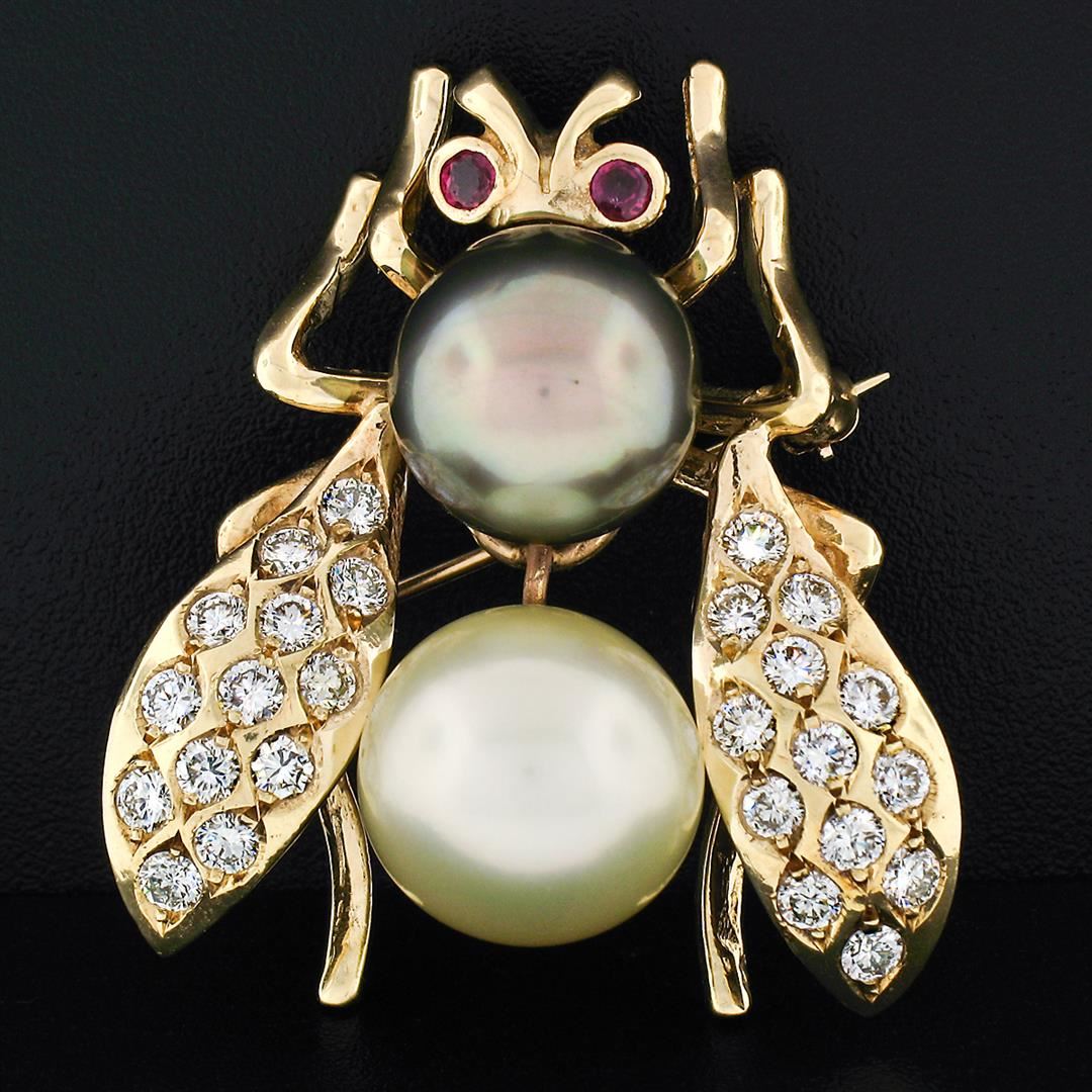 A vintage solid 14k yellow gold bee pin brooch, with 1 round tahitian pearl (11.2mm), 1 round cultured pearl (12.2mm ), 2 round brilliant rubies (0.14ctw), and 26 round brilliant natural diamonds (E/F - VVS2/VS1 ; 1.30ctw). Measures 35x30.8mm and weighs a total of 12.77 grams.