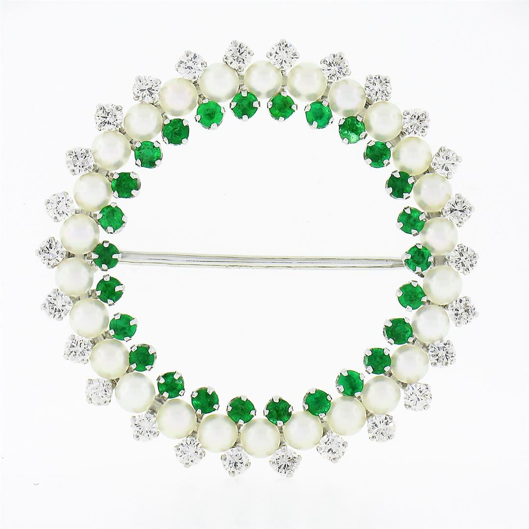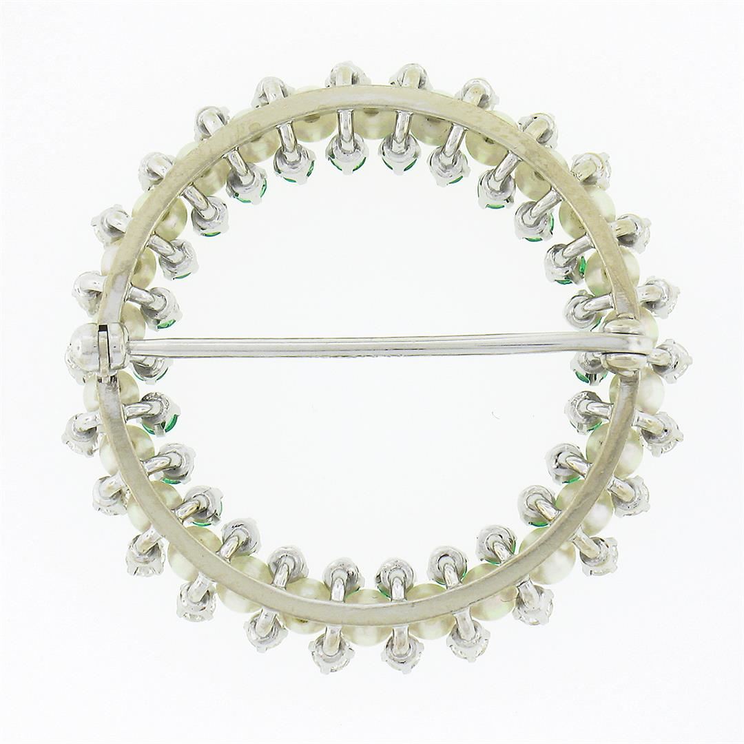 A vintage solid 14k white gold wealth brooch, with 26 round brilliant cut natural diamonds (G/H - VS1/VS2 ; 0.85ctw), and 26 round brilliant cut natural emeralds (0.75ctw), and 26 round shape cultured pearls (3.1mm each). Measures 32.30mm in diameter and weighs a total of 6.43 grams.