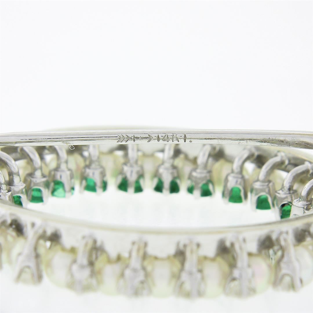 A vintage solid 14k white gold wealth brooch, with 26 round brilliant cut natural diamonds (G/H - VS1/VS2 ; 0.85ctw), and 26 round brilliant cut natural emeralds (0.75ctw), and 26 round shape cultured pearls (3.1mm each). Measures 32.30mm in diameter and weighs a total of 6.43 grams.