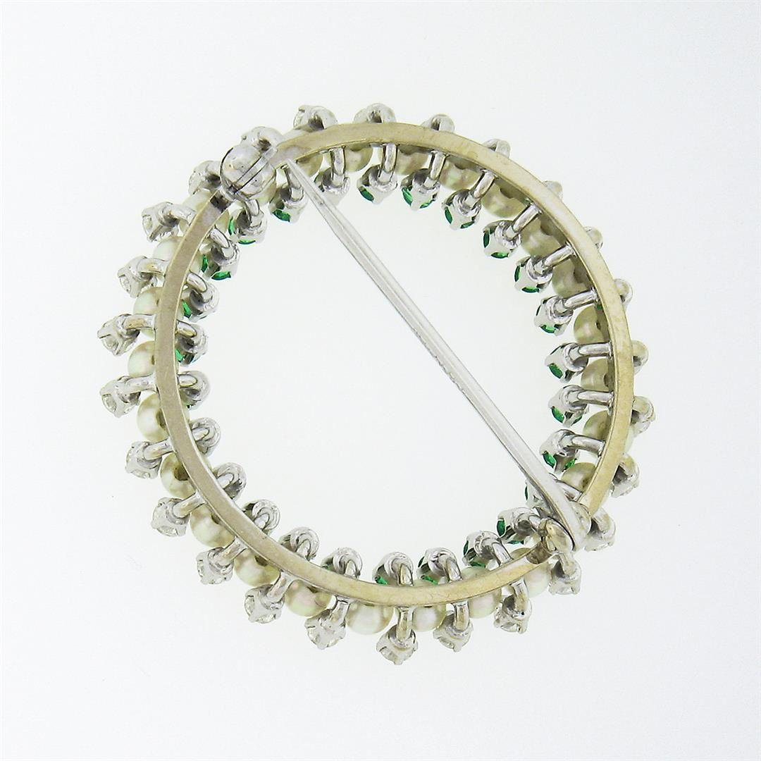 A vintage solid 14k white gold wealth brooch, with 26 round brilliant cut natural diamonds (G/H - VS1/VS2 ; 0.85ctw), and 26 round brilliant cut natural emeralds (0.75ctw), and 26 round shape cultured pearls (3.1mm each). Measures 32.30mm in diameter and weighs a total of 6.43 grams.
