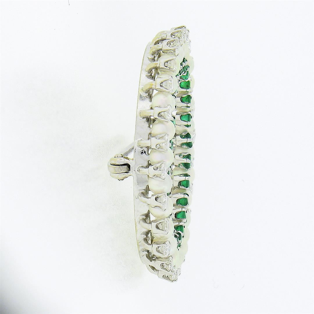 A vintage solid 14k white gold wealth brooch, with 26 round brilliant cut natural diamonds (G/H - VS1/VS2 ; 0.85ctw), and 26 round brilliant cut natural emeralds (0.75ctw), and 26 round shape cultured pearls (3.1mm each). Measures 32.30mm in diameter and weighs a total of 6.43 grams.