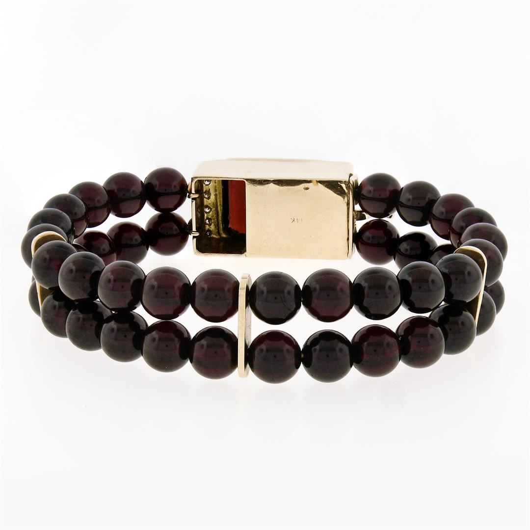 A vintage, dual strand, 44 round garnet bead bracelet crafted from 14k yellow gold featuring a large 12.50ct emerald cut garnet and 0.24ctw round brilliant diamond (F/G - VS1/VS2) centerpiece. It weighs a total of 49.53 grams, measures 13.65mm wide, and will comfortably fit up to a 6.5 inch wrist.