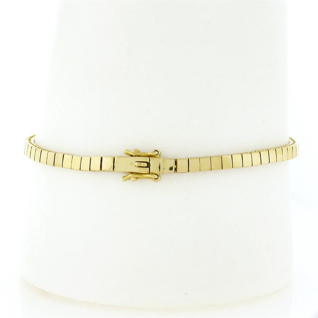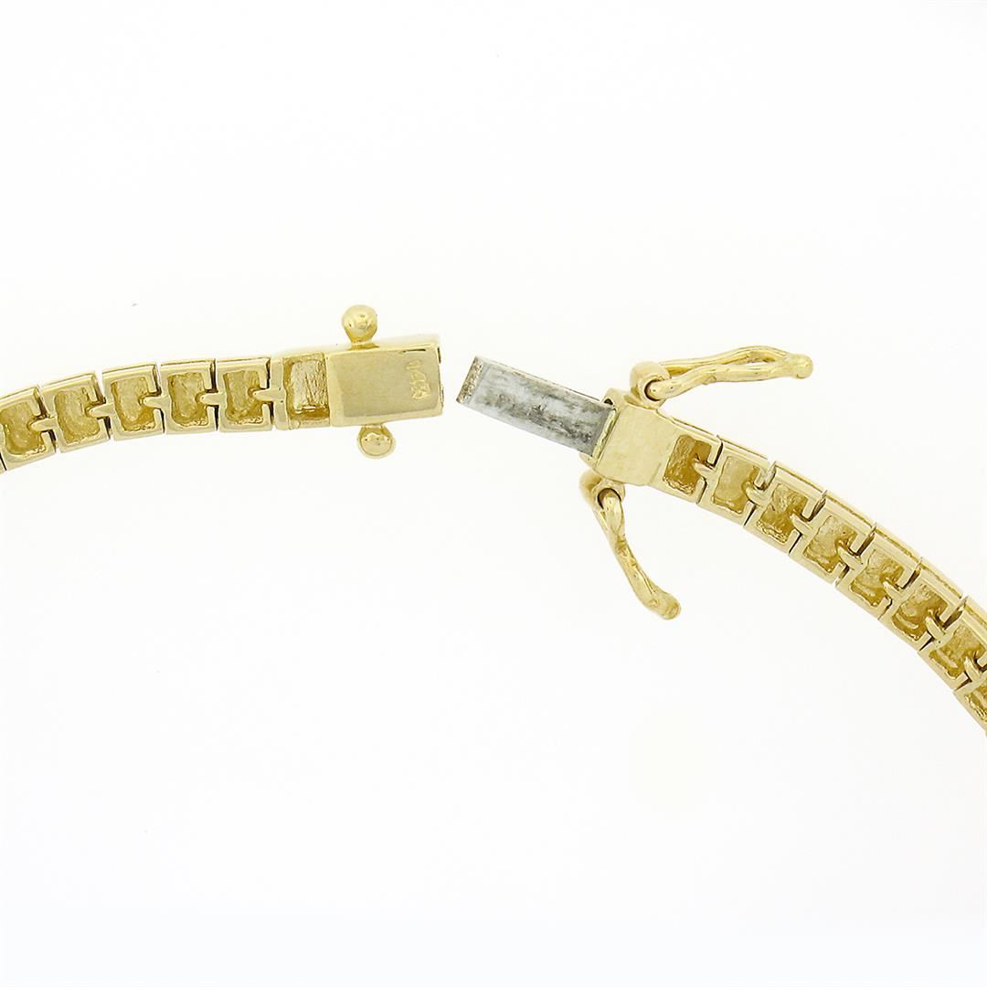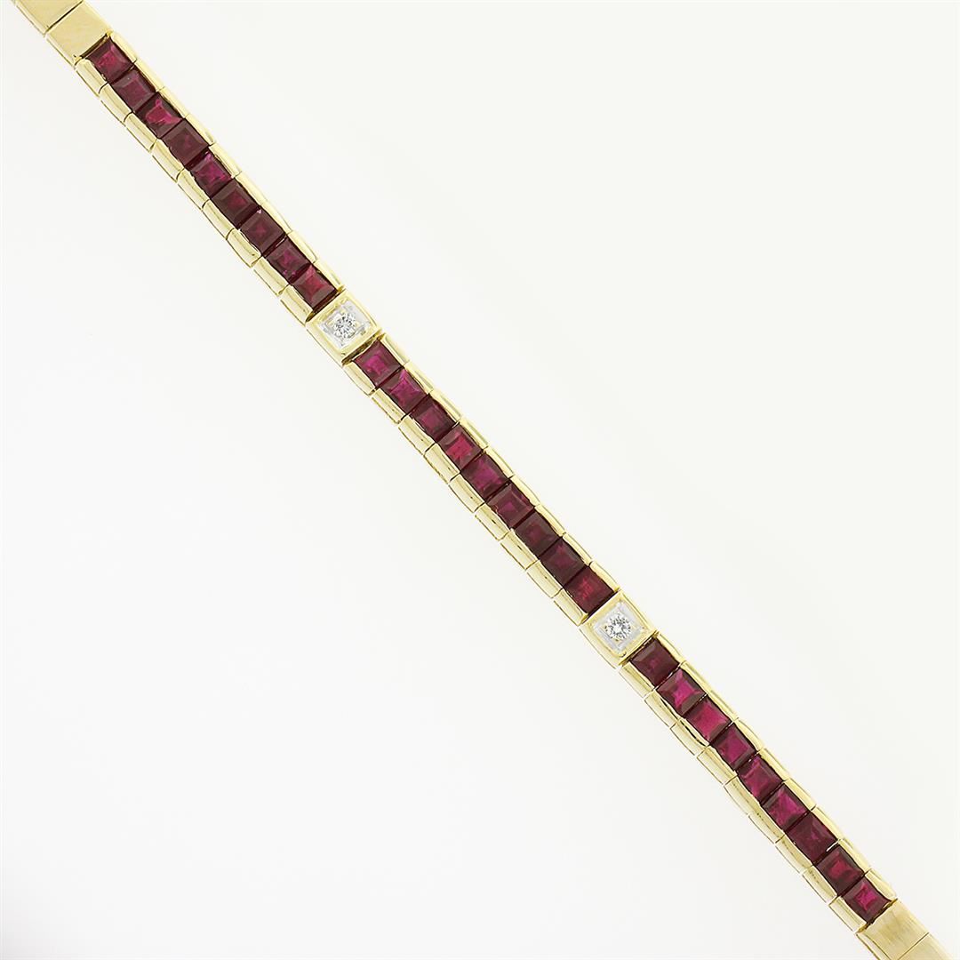 A solid 14k yellow gold square link line bracelet, with 27 square step cut natural rubies (2.0ctw ), and 2 round brilliant cut natural diamonds (G/H - VS1/VS2 ; 0.03ctw). It weighs a total of 9.29 grams, measures 3mm wide, and measures 7 inches in length.