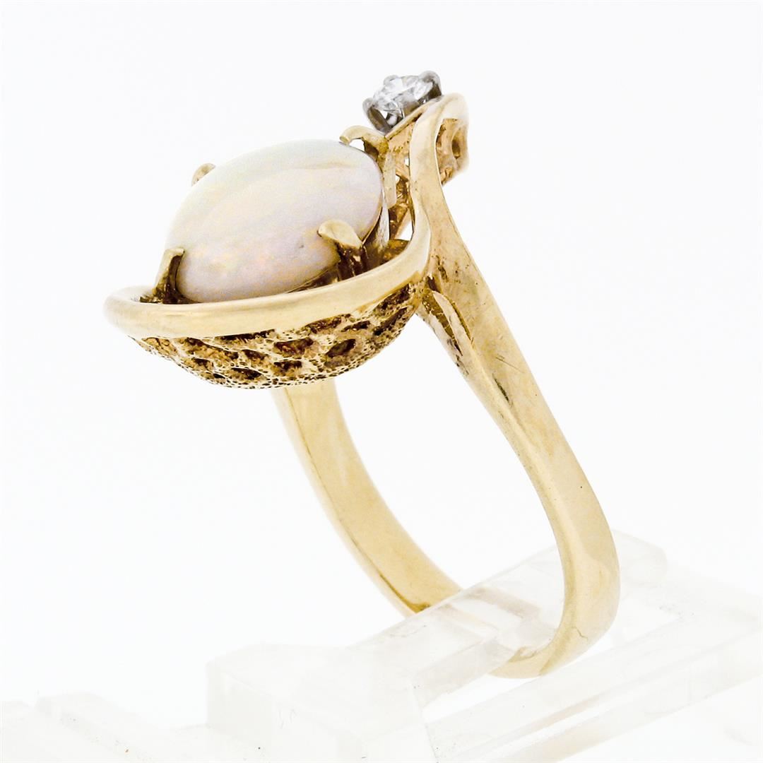 A vintage solid 14k yellow gold ring with 1 oval cut natural opal (11.39x9.34mm; 2.00ct) and 1 round brilliant cut natural diamond (H - VS1; 0.07ct). The ring is size 6.0, weighs a total of 6.13 grams, and measures 21.25mm wide.