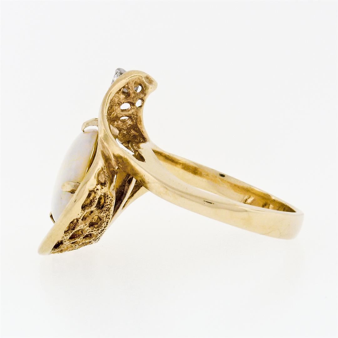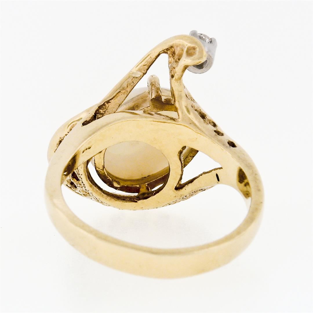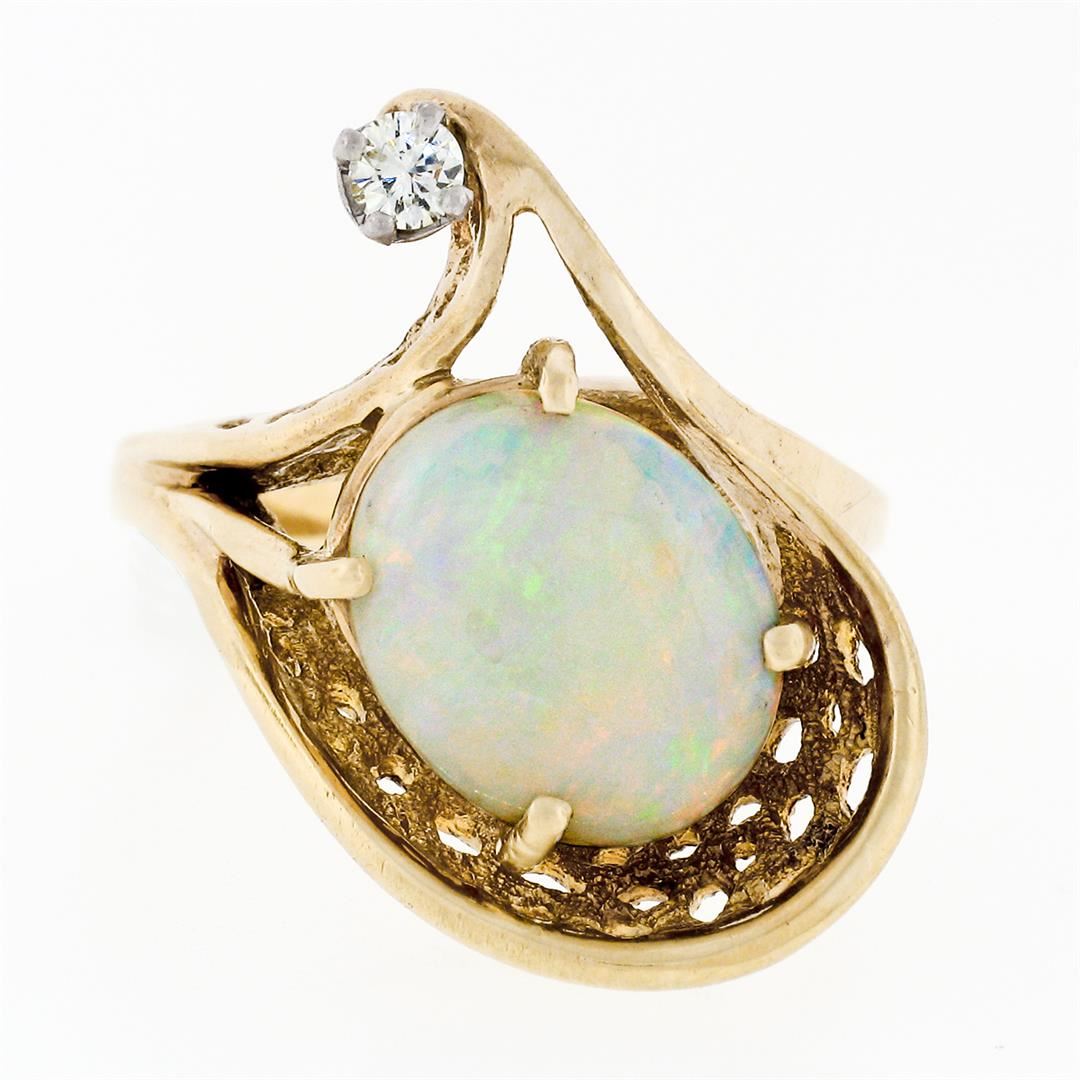 A vintage solid 14k yellow gold ring with 1 oval cut natural opal (11.39x9.34mm; 2.00ct) and 1 round brilliant cut natural diamond (H - VS1; 0.07ct). The ring is size 6.0, weighs a total of 6.13 grams, and measures 21.25mm wide.