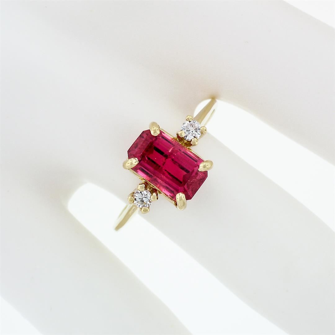A vintage solid 14k yellow gold three stones ring, with 1 long emerald cut natural tourmaline (9.59x5.89mm - 2.08ct), and 2 round brilliant cut natural diamonds (G - VS2; 0.12ctw). The ring is size 8.5, weighs a total of 2.83 grams, and measures 9.67mm wide.