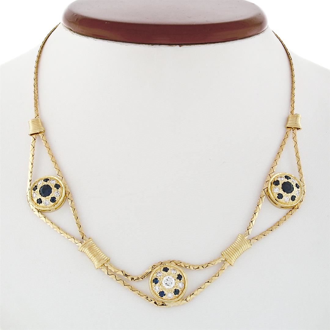 A vintage solid 14k yellow gold statement necklace, with 17 round cut natural sapphire (1.60ctw), and 16 round brilliant cut natural diamonds (F/G - VS1/VS2; 0.68ctw). 16 inch heart shaped serpentine style link chain, 17.50 grams total weight, pendant measures 147.05x51.22mm.