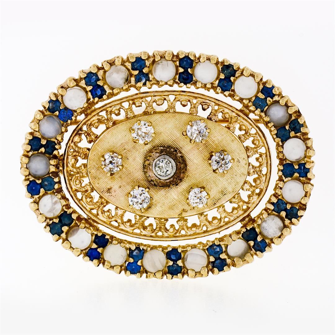 A vintage solid 14k yellow gold brooch pendant, featuring 7 old european and mine cut natural diamonds (G/H - SI1/SI2 ; 0.70ctw), with 34 round cut nagtural sapphires (1.70ctw), and 17 round cabochon cut natural moonstones (3.0mm ). Measures 39.8x31mm and weighs a total of 16.79 grams.