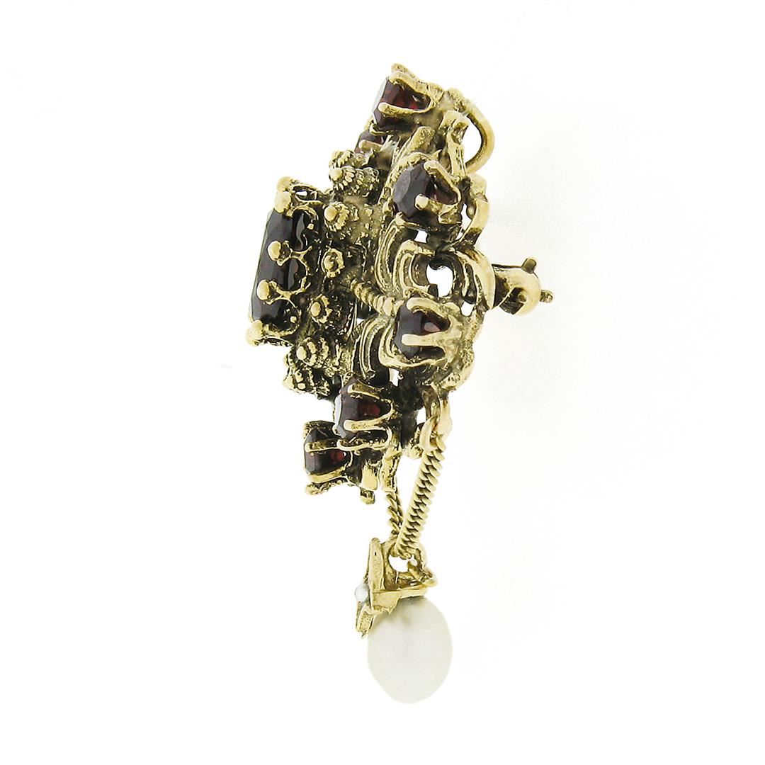 A solid 14k yellow gold dangle pin brooch pendant, with 10 round and oval cut natural garnets (4.0ctw), and 1 oval shape cultured pearl (7.1x5.8mm), and 1 round shape cultured seed pearl (1mm). Measures 28.0x41.75mm and weighs a total of 12.17 grams.
